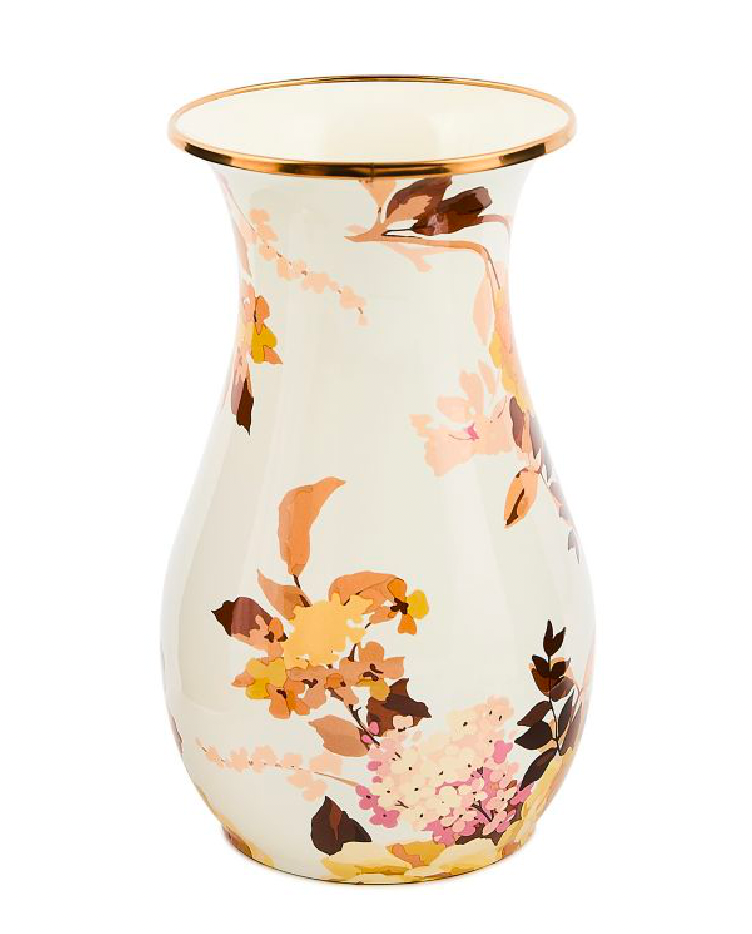 Farm-fresh and inspired by traditional glass milk jugs, the Wild Rose White Tall Vase is the kind of vase that’s just right for a casual wildflower bouquet, cherry-blossom branches or pussywillow stalks. It’s made of hand decorated enameled steel, decorated with hand-painted, Wild Roses, and trimmed with a bronzed rim.