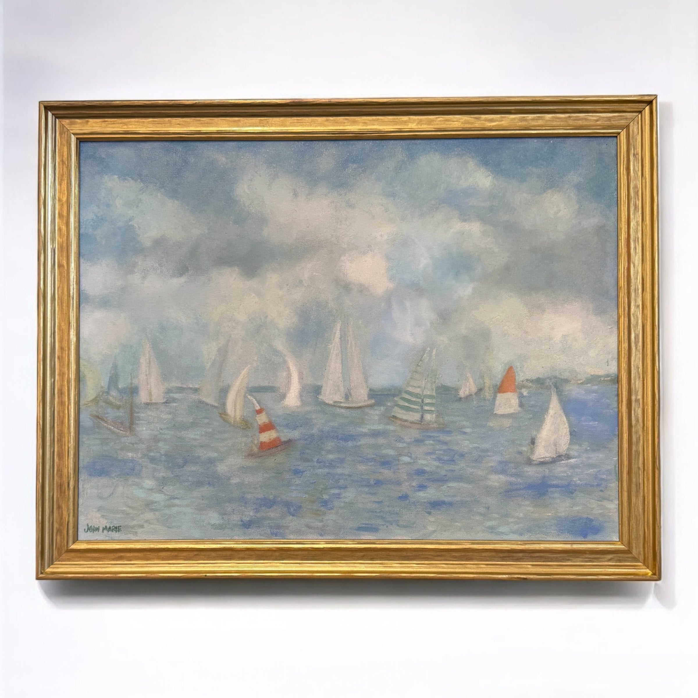 The image depicts a scene with multiple sailboats on the water, characteristic of a regatta or sailing race.