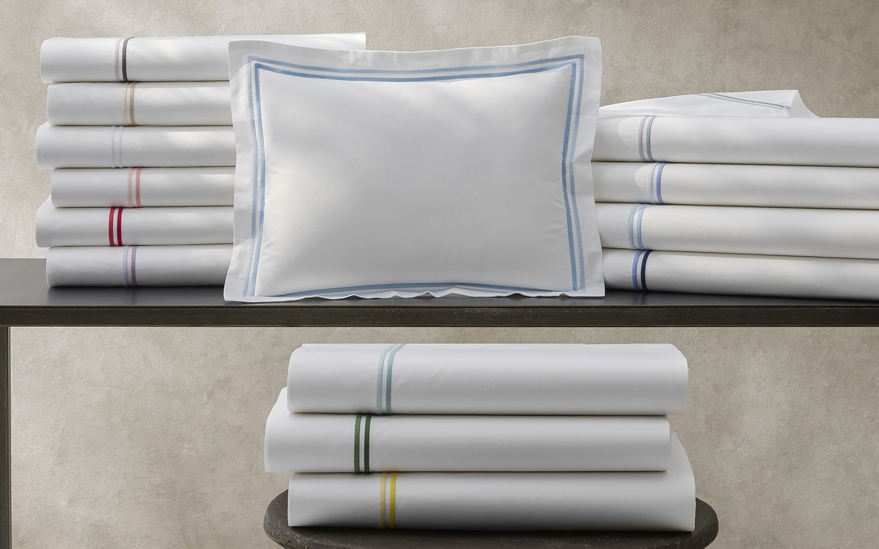 Our popular 350 thread count Sierra sheeting is accented with a pair of crisp lines of satin stitch embroidery in colors from subtle to cheerful. Essex brings a smart, European hotel feel and modern, elegant air to the bedroom.