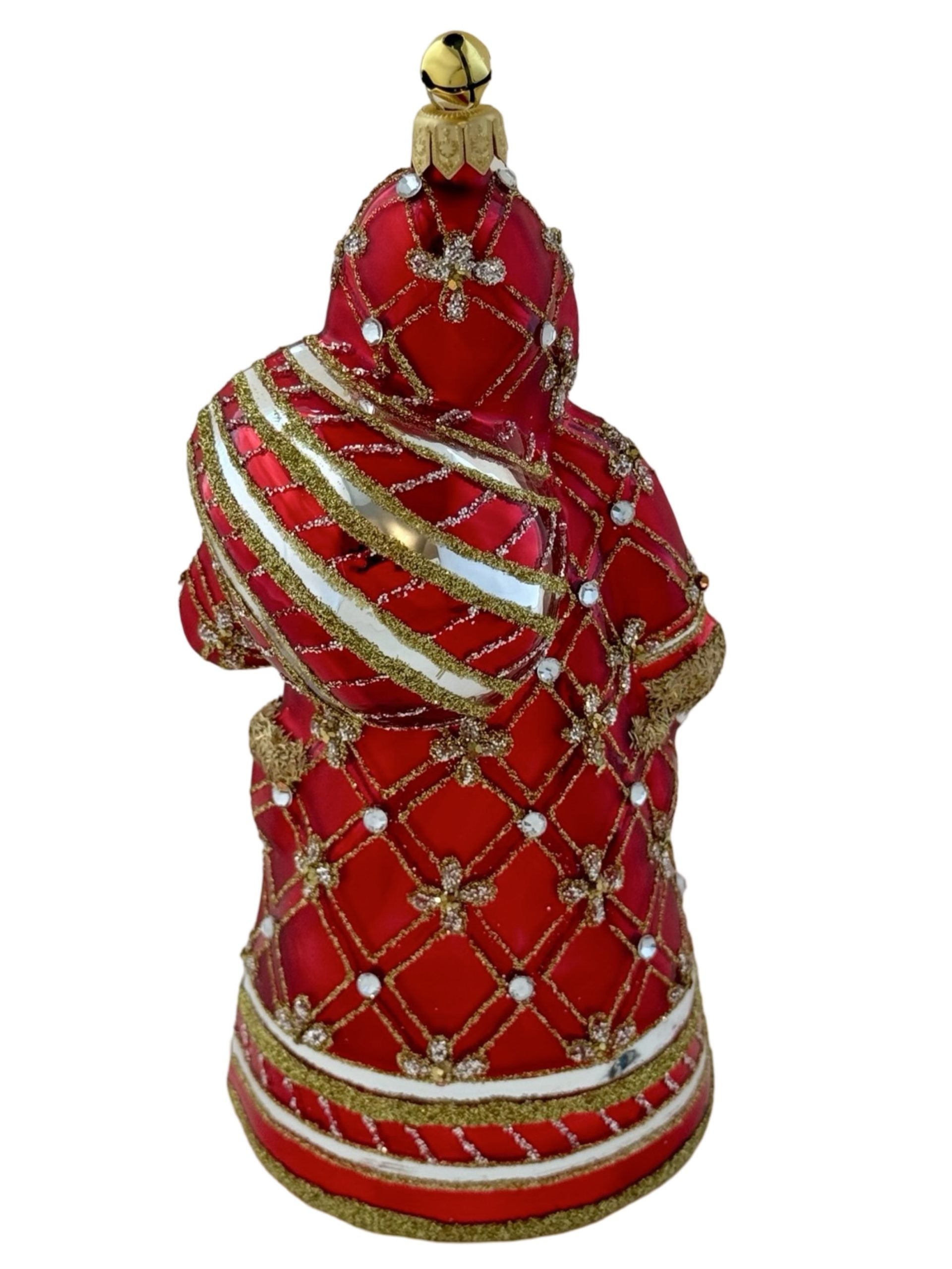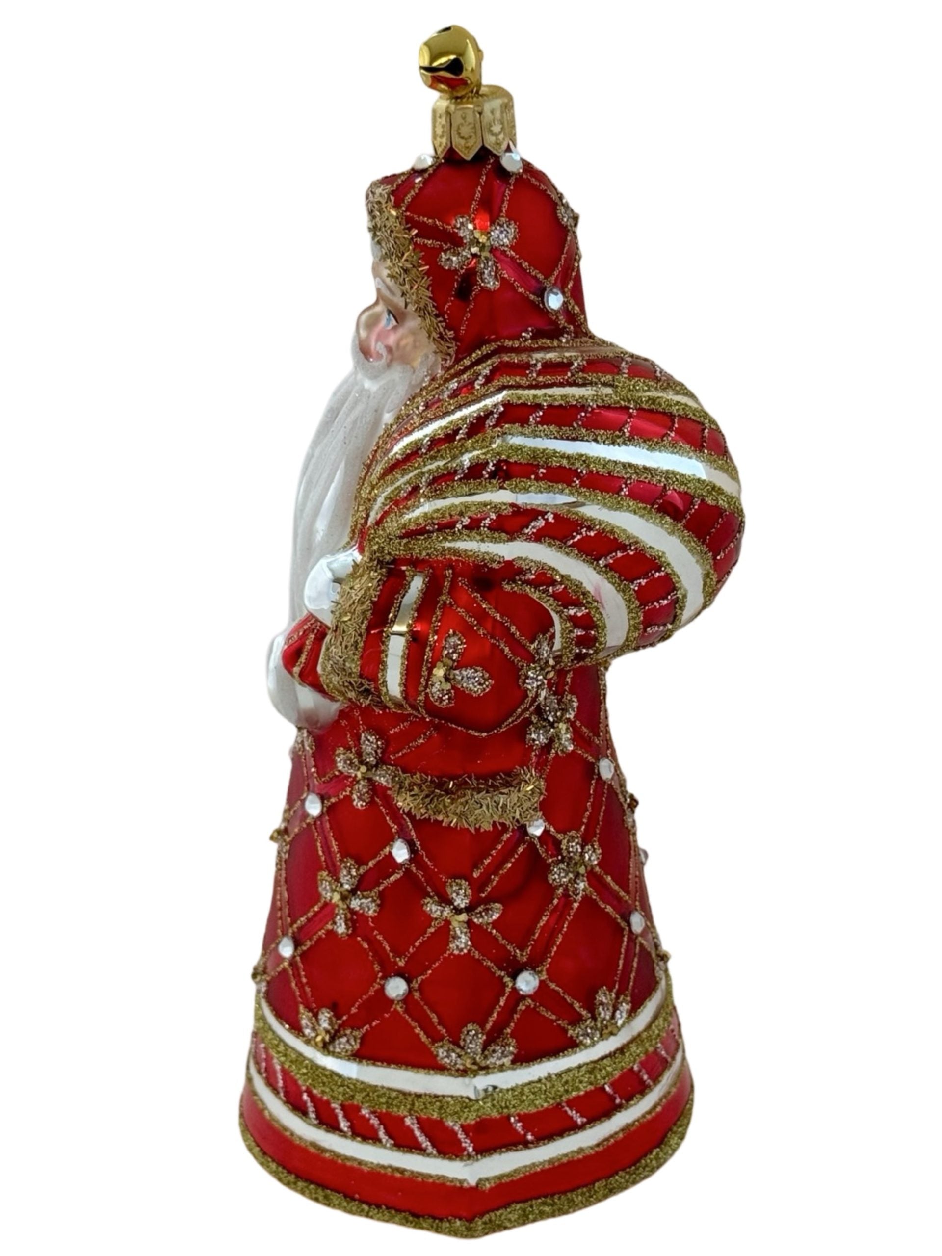 - Unique Hand Painted Red Jeweled Coat Santa Ornament Holding a Red, Gold Glitter and Silver Stripe Sack of Presents