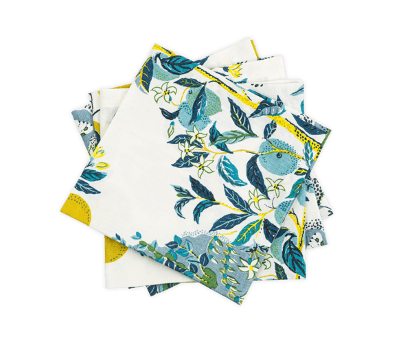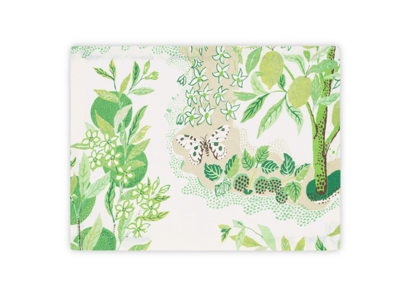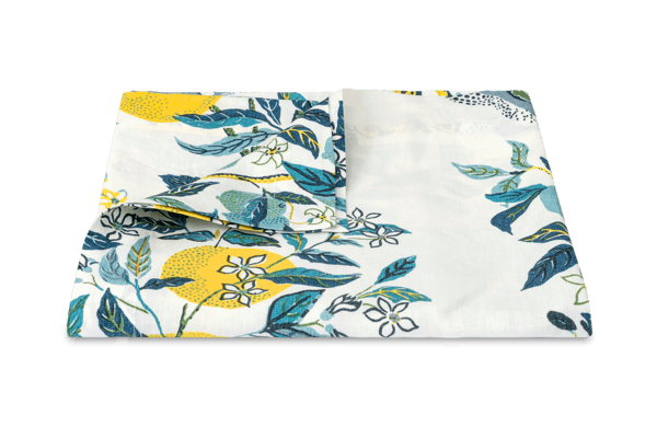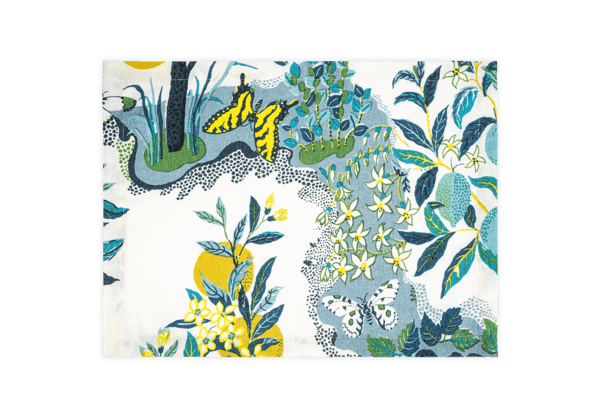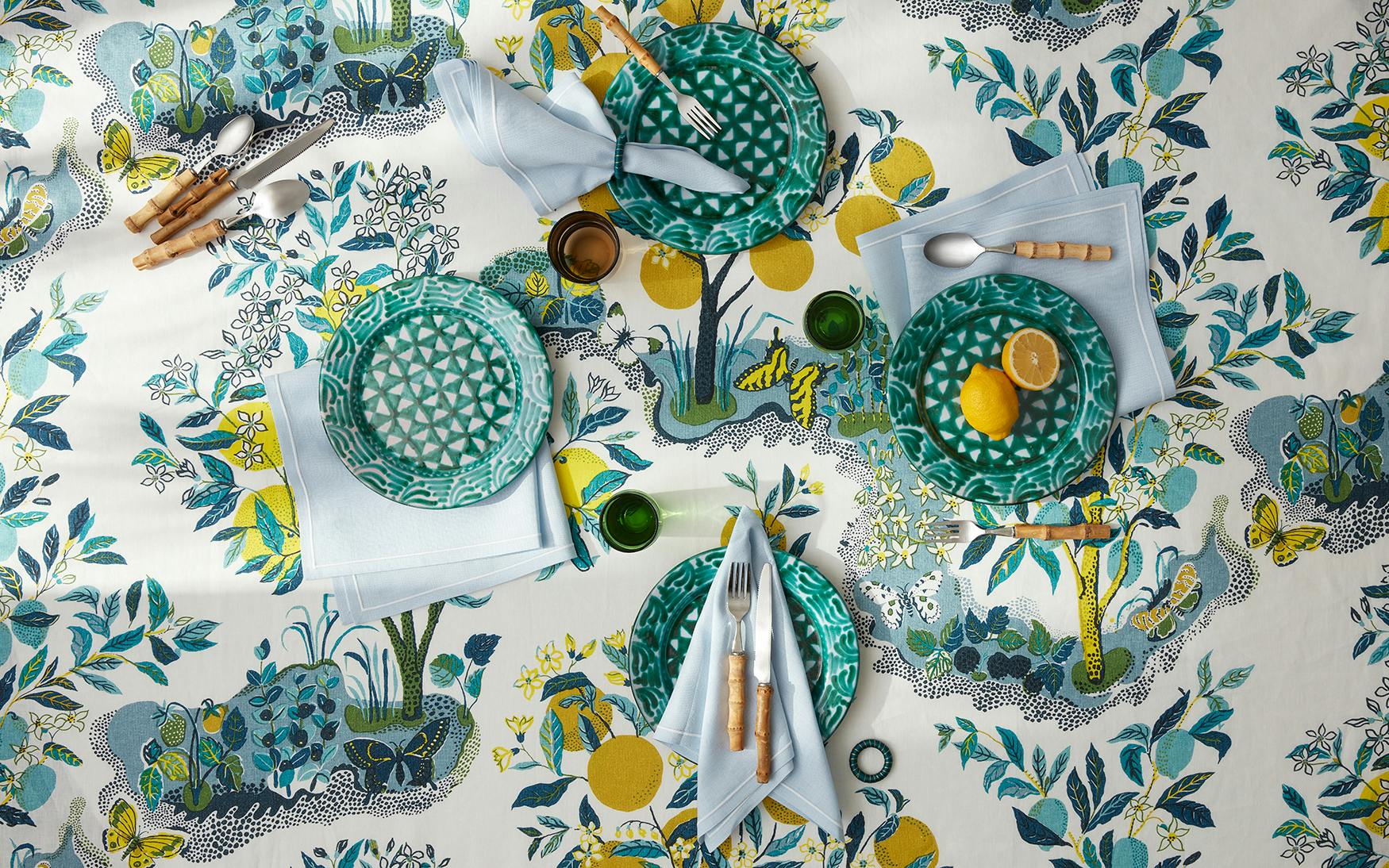Infused with color and wit, Schumacher’s Citrus Garden—which is based on an archival pattern hand-drawn by the iconic Josef Frank—is instantly recognizable. Here we’ve printed it on our crisp linen for a tabletop look filled with inimitable whimsy and charm.