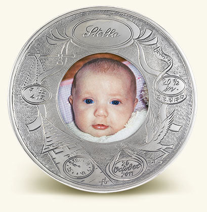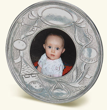 Celebrate a new arrival with our decorative round baby frame, which can be personalized with the newborn’s name, birth date, time, length and weight. Each frame is finished with a handsome wood backing. Match frames are meant to enhance, not upstage, the photographs or other remembrances held within. Each collection was purposely designed to effortlessly display with the others. Each frame is stamped with hallmarks representing our workshop, our company, the tin content of our alloy and the region of Italy where our pieces are made.