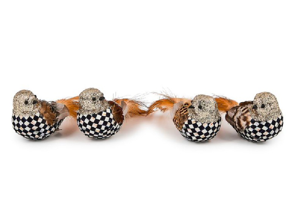 This set of four autumn-inspired bird figurines features Courtly Check® on their breasts, topped with a mix of fabrics, including velvet and brocade. They’re accented with faux fur and feathers.