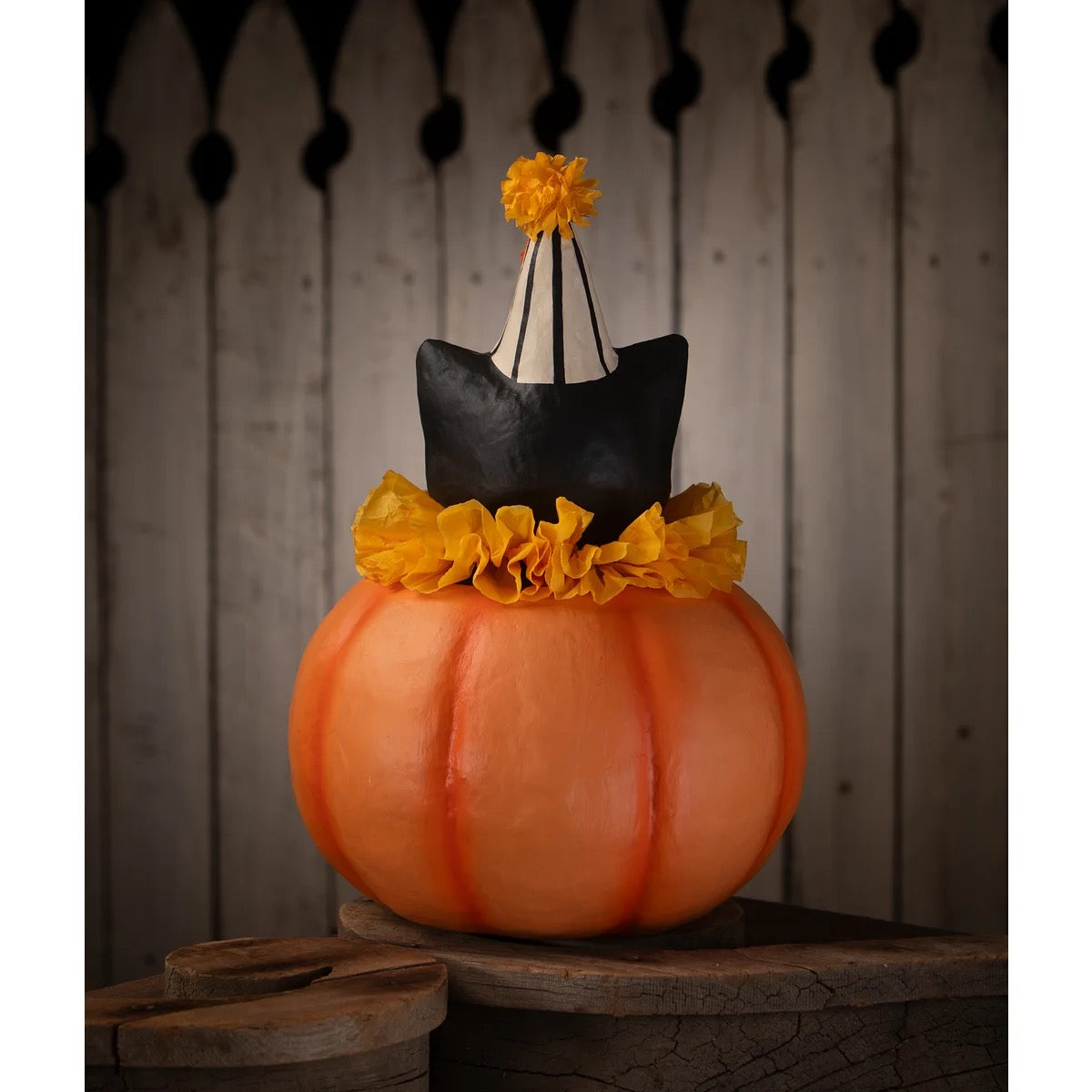Cecil is hanging out waiting for the party in this large paper mache pumpkin. This cat has a yellow crepe paper collar around his neck and wears a black and white stripped hat adorned with yellow and orange crepe paper poms. Make him a part of your Halloween traditions!