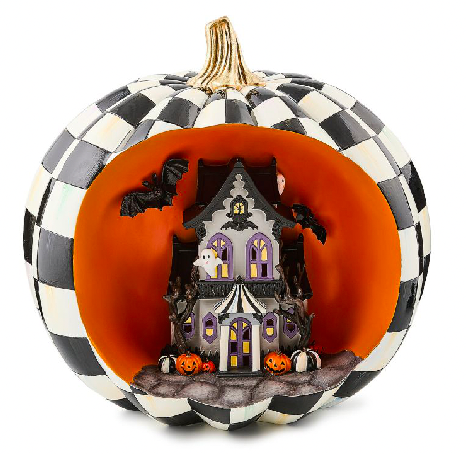 Set Halloween aglow with the Haunted House-Pumpkin Scene Illuminated pumpkin, featuring haunted house cutout. A battery-operated LED flickering flame lights up the interior.
