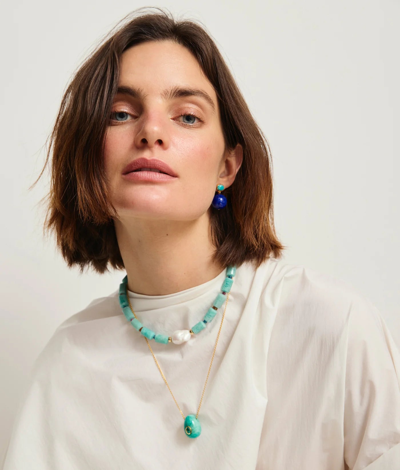 Make your picturesque style pop in saturated jewel-toned earrings, in gold-plated brass and amazonite with hanging lapis bead drops.