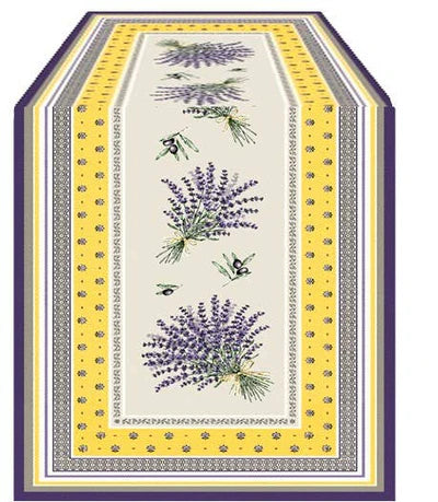 Luxurious jacquard-woven table runners in beautiful lavender and olives woven design. This table runner features bordering stripes of varying shades of purple, yellow, white, and a light pale brown. The center of the design is a pale cream color and features bunches of lavender and small segments of an olive tree.