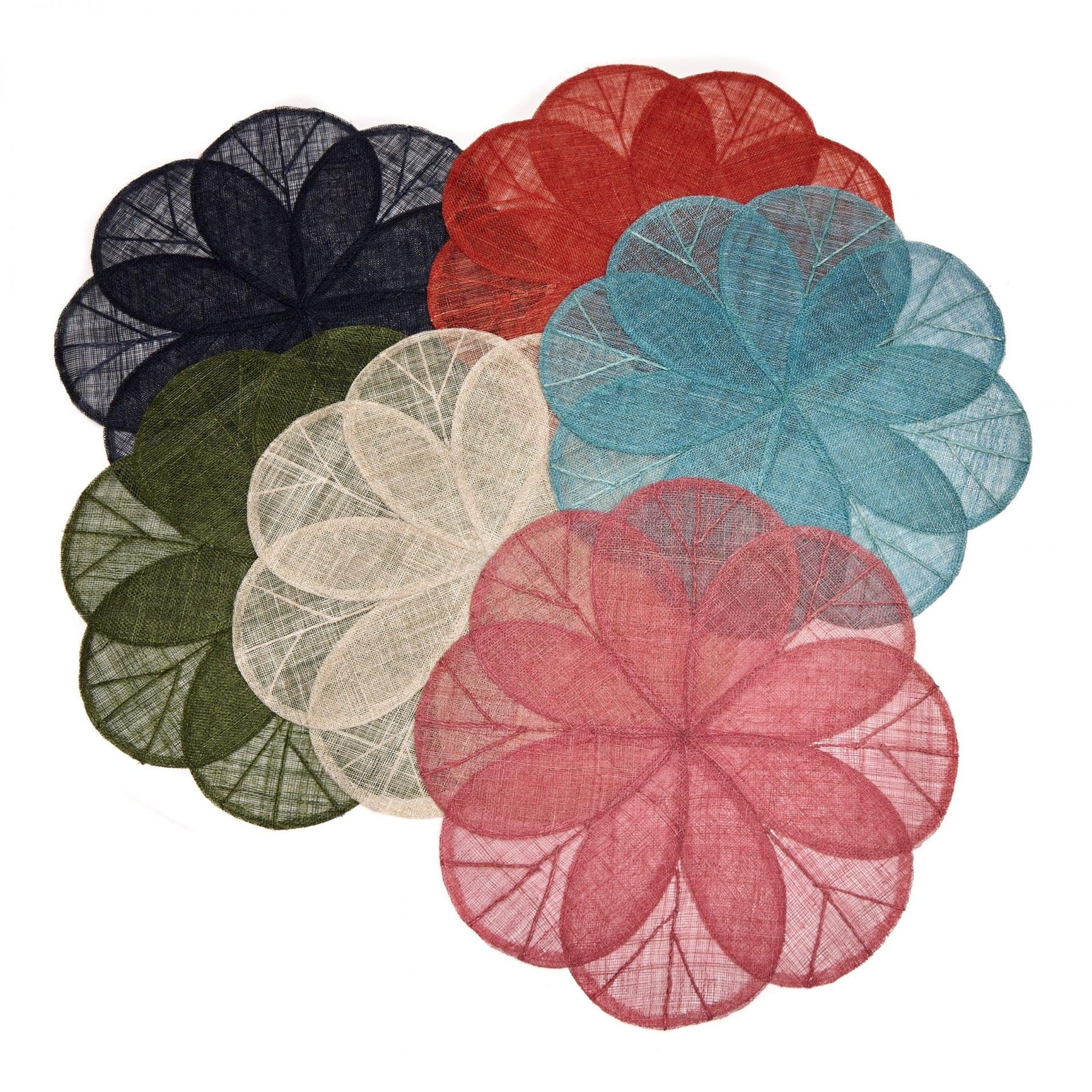 A bestseller made of woven abaca fibers, cut and sewn into a sheer floral mat. Great for layering and making a happy statement, hand crafted charm is abundant with our Sinamay placemat.