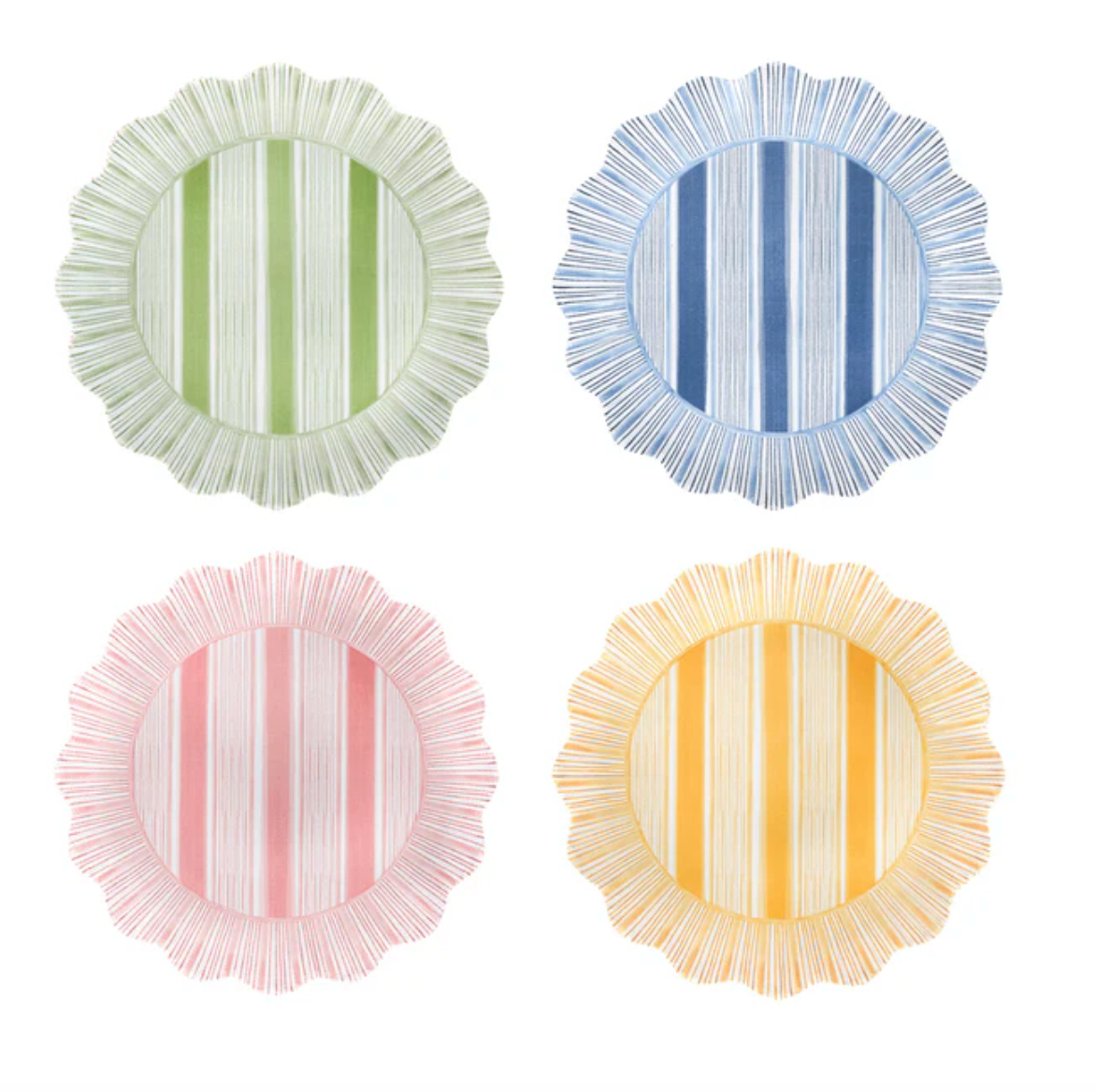 eminiscent of a sunburst, we’ve added a radiant ruffle trim in vibrant and happy hues to the classic cabana stripe—making this chic and shatterproof plate set a splash more special, feminine, and fun.