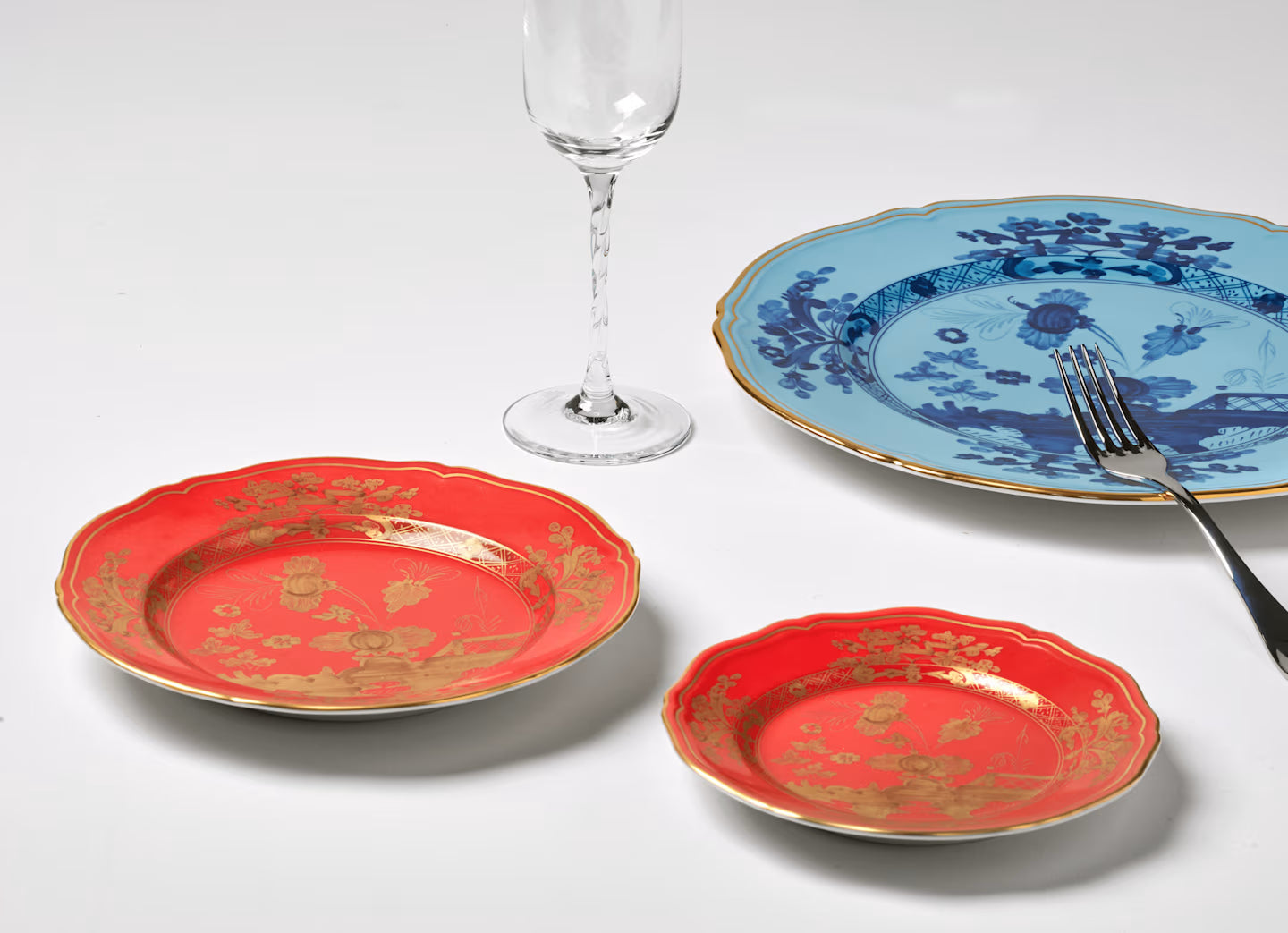 Porcelain bread plates with red and pure gold Rubrum decoration. Oriente Italiano Gold Collection. The two bread plates are characterized by fine porcelain embellished by the delicate decoration in hand-painted pure gold that stands out in contrast with the distinctive intense red of the Rubrum color. The service is completed by the flat, soup and dessert dishes of the same line, for unique and sophisticated mise en place. The Oriente Italiano Gold Collection enriches the proposal of Ginori 1735, and is available in an assortment of tableware, tea and coffee, furnishing accessories and original room diffusers, also in the Aurum version.