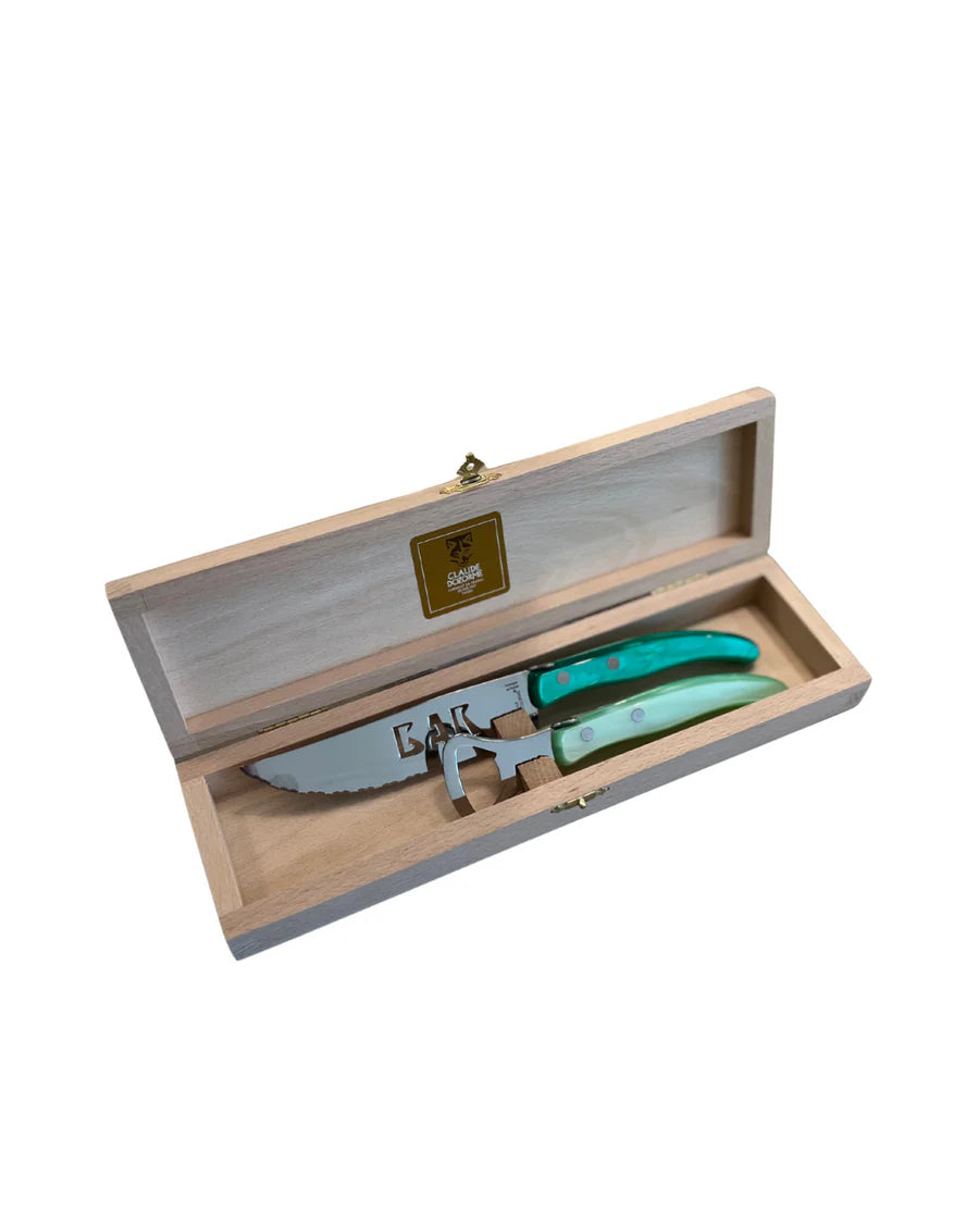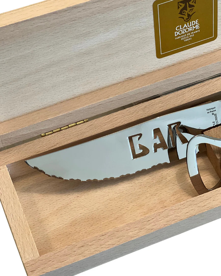 Handcrafted in France with traditional techniques, this 2-piece set includes a bottle opener and a "Bar" knife stored in a wooden box.