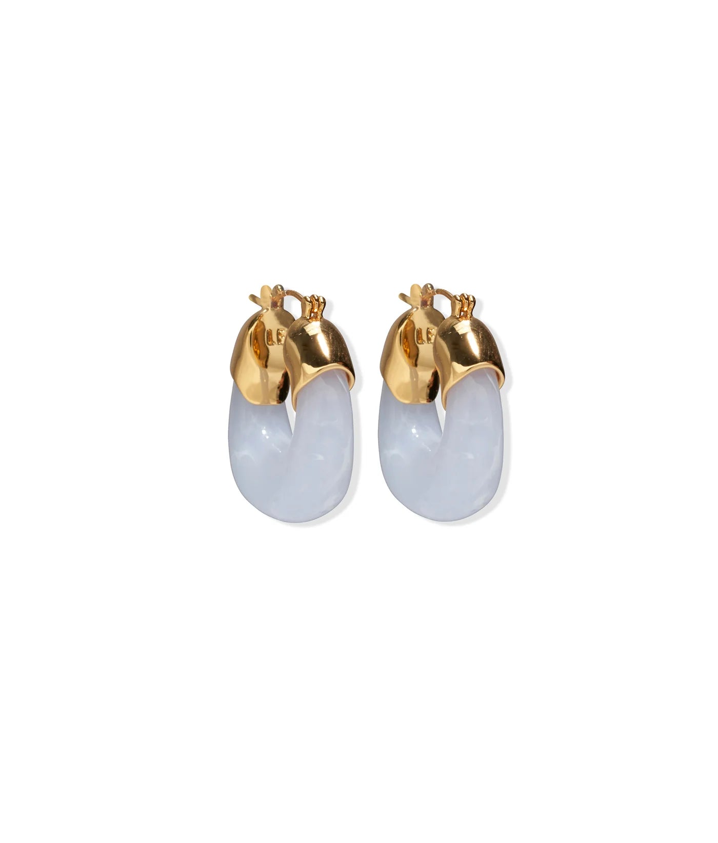 - Materials: Gold-plated brass and marbled light blue-colored resin acrylic hoop earrings