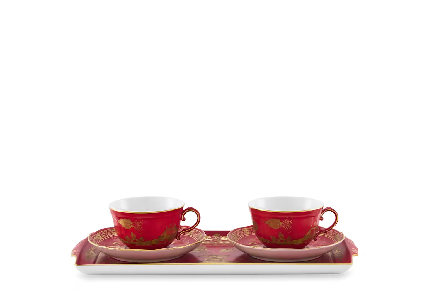 A deep red enhances the set of tea cups with saucers, embellished with the refined Rubrum pattern. Complete with platter, this tea cup set is the ideal accompaniment for those who appreciate conviviality and wish to elevate the tea ritual to an experience of elegance and pleasure. Combine elements from the Oriente Italiano tableware and home decor collection by experimenting with unusual and sophisticated combinations to make each of your relaxing moments different, original and colorful. The tea cup set comes in an elegant gift box, making it the perfect gift for weddings, anniversaries, birthdays or any occasion you want to make memorable. Immerse yourself in the Oriente Italiano collection: finely elaborate floral patterns, vibrant hues and elegant lines infuse every room in the home with an aura of refined beauty. An authentic tribute to the art of Ginori 1735 craftsmanship.