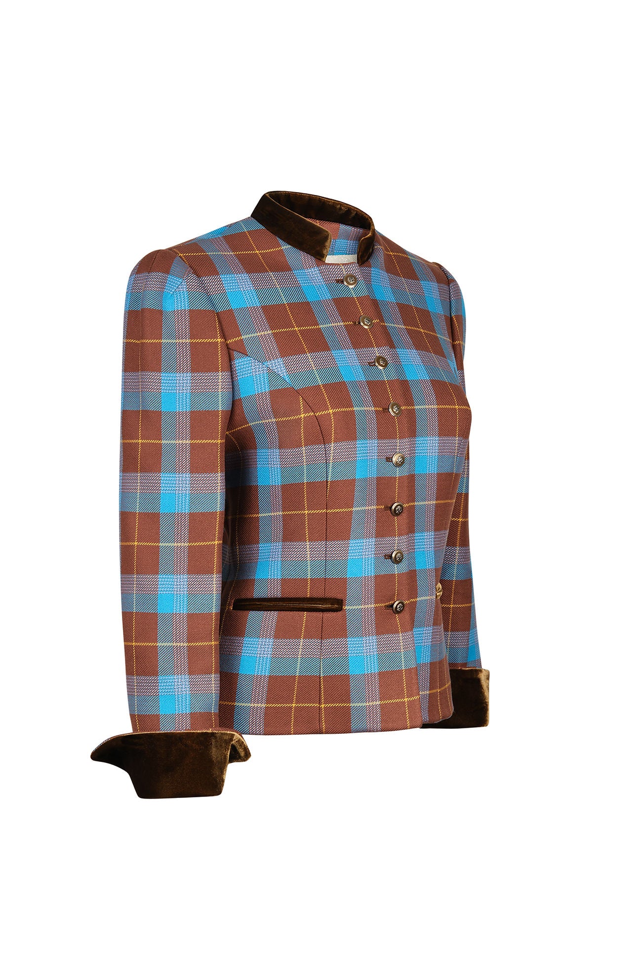 - Design: High-neck, gold buttoned front, velvet contrast cuffs