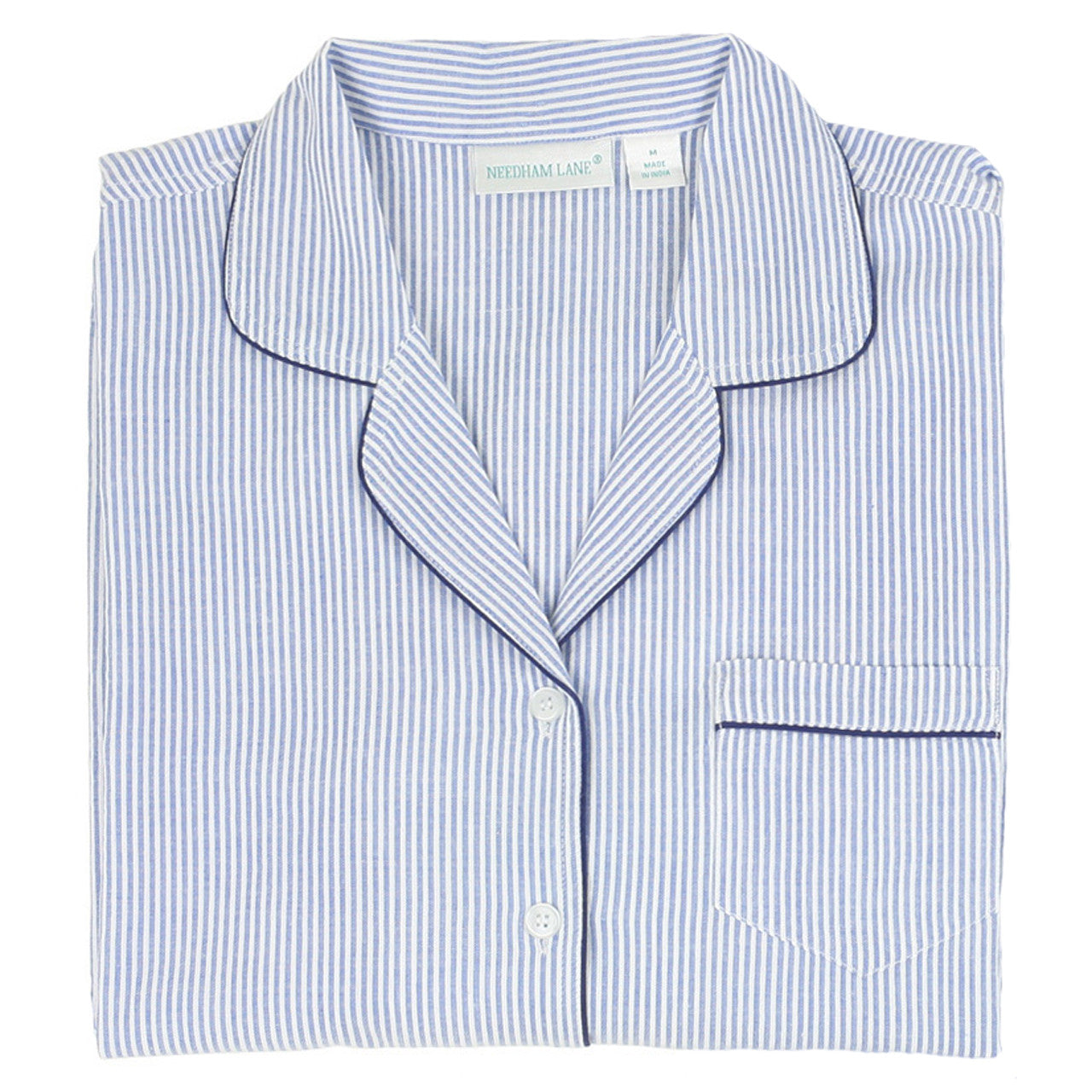 Everyone loves blue & white! Women's classic long sleeve, 2-piece pajama set in very soft woven all cotton seersucker. The best seersucker that you'll find. Woven cotton, not knit. Light and comfortable pajamas. Our signature pajamas are designed for a comfortable and relaxed fit. These are pajamas that you want to come home to at the end of the day. All day comfort on the weekends... all night comfort on those days in between weekends. Perhaps your new best friend. Seersucker cotton is woven so that some threads will bunch together. This bunching of threads causes the fabric to be slightly held away from the body. Keeping the fabric away from your skin helps air flow and to keep you cool. A classic fabric for year round wear. If you experience hot flashes at night, seersucker can help bring you cool nights. No need to look further for wonderful seersucker sleepwear, you've found it here at Needham Lane. Not made in China.
