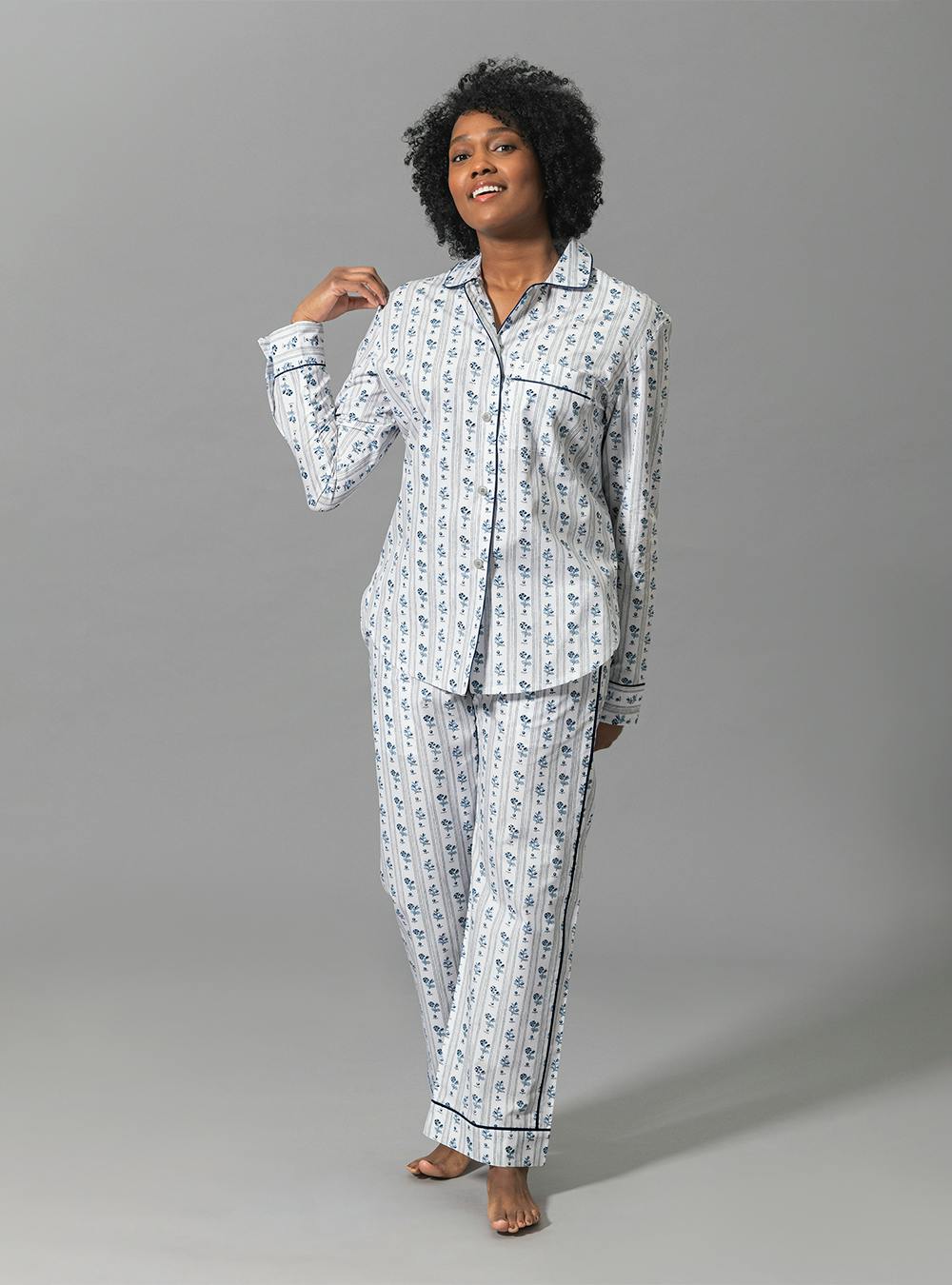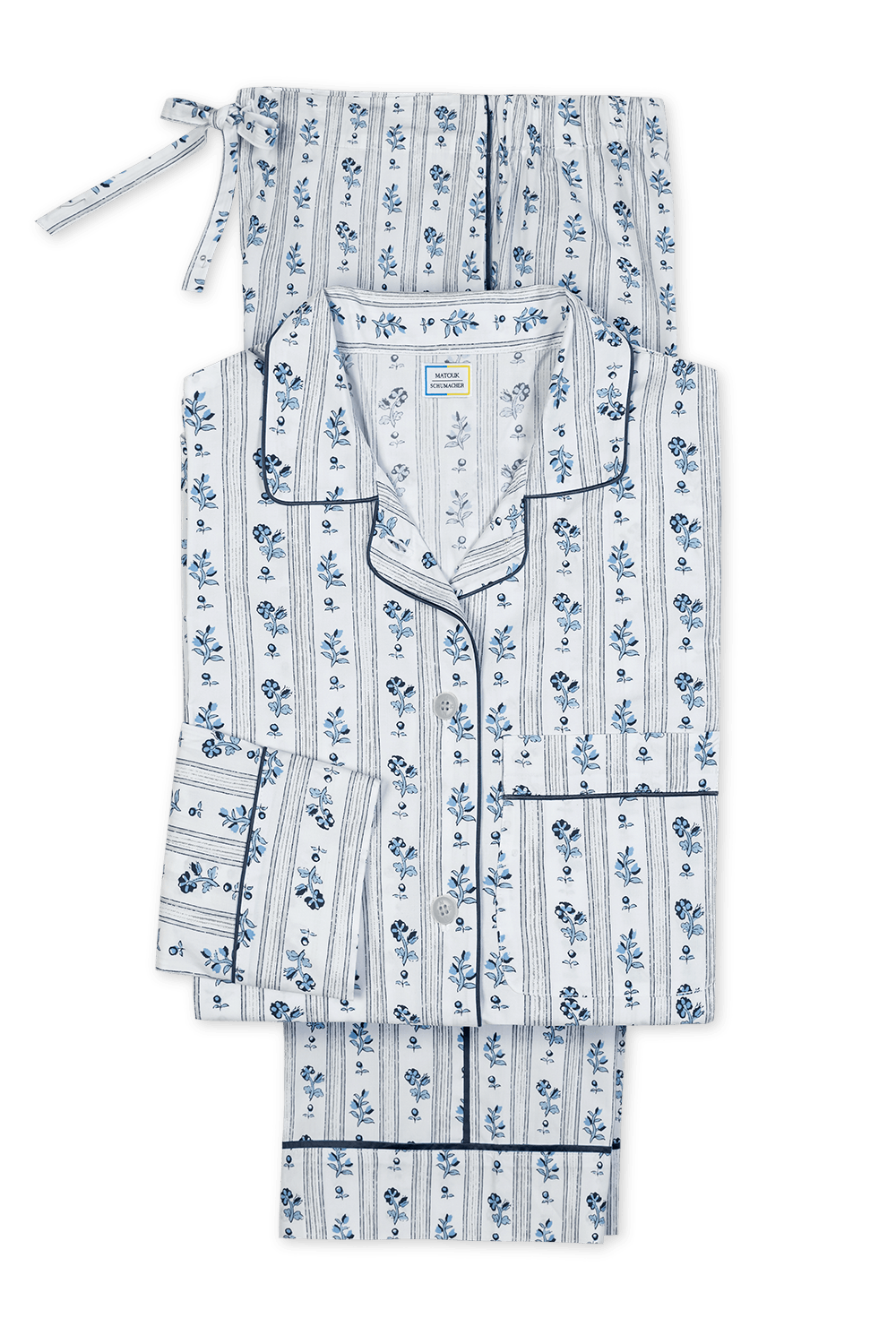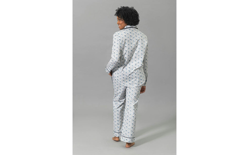 Crafted from our dreamy Luca cotton percale in a range of vibrant Schumacher prints, we’ve combined the luxury of Matouk sheeting with the comfort of your favorite lived-in dress shirt. The top features natural corozo buttons, piped details, and a scooped hem. The drawstring trousers have elastic in the back for extra comfort and a flattering fit. Beautifully tailored, these pajamas are just as chic outside the house as they are in the bedroom.