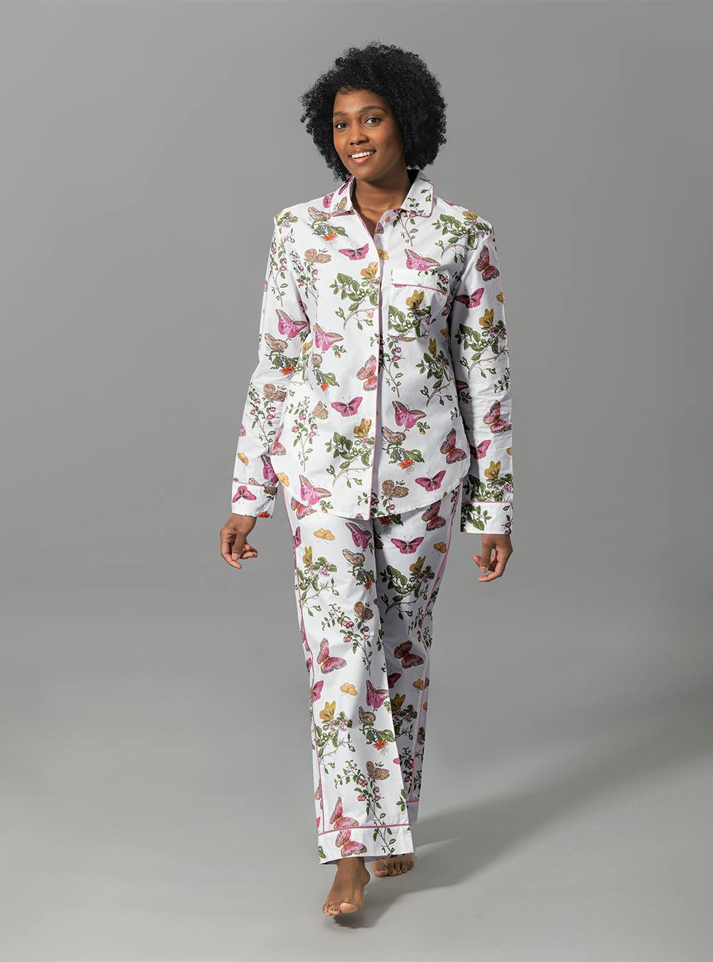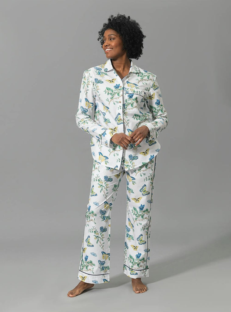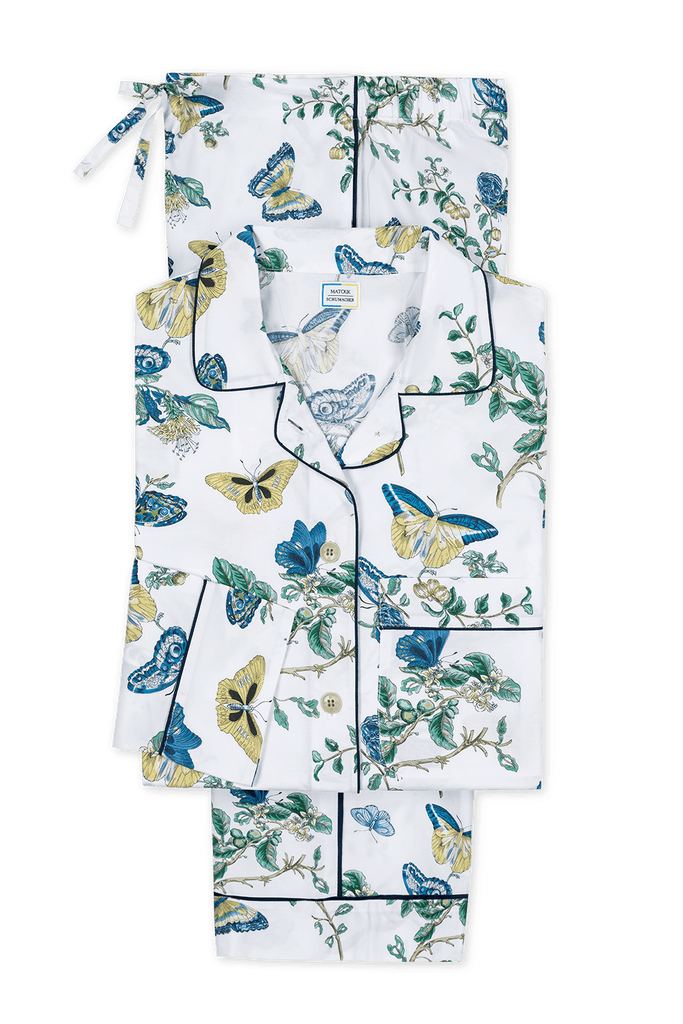 Crafted from our dreamy Luca cotton percale in a range of vibrant Schumacher prints, we’ve combined the luxury of Matouk sheeting with the comfort of your favorite lived-in dress shirt. The top features natural corozo buttons, piped details, and a scooped hem. The drawstring trousers have elastic in the back for extra comfort and a flattering fit. Beautifully tailored, these pajamas are just as chic outside the house as they are in the bedroom.