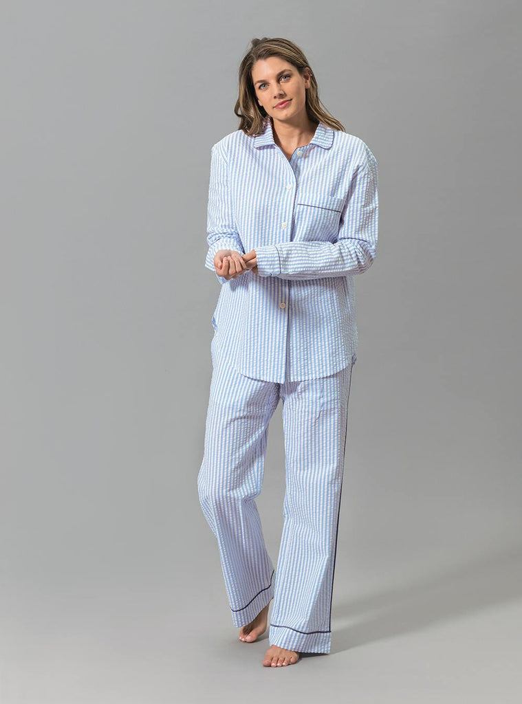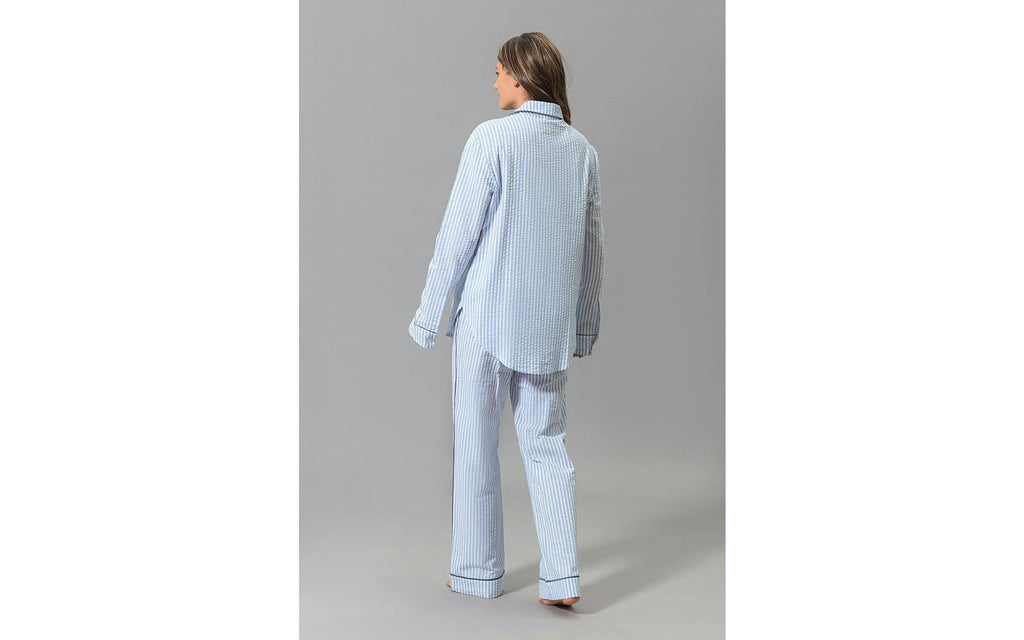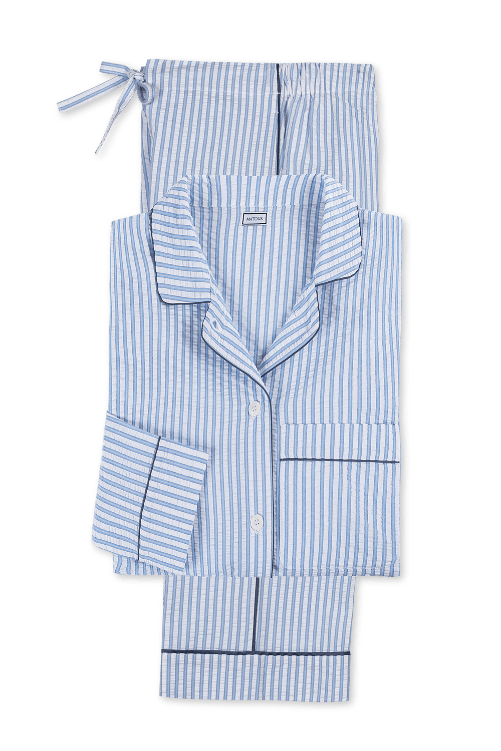 Elevate your loungewear with our Matteo pajamas, featuring a button-down shirt and drawstring pant in lightweight seersucker cotton. This classic striped look adds sophistication to leisurely nights and mornings, and looks just as great out of the house as it does curled up at home.