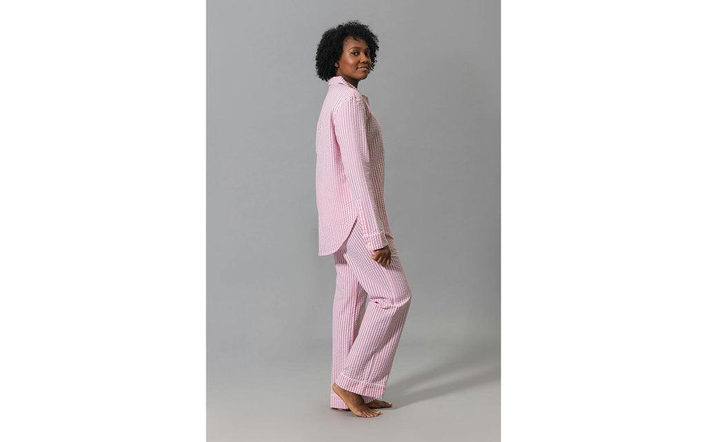 Elevate your loungewear with our Matteo pajamas, featuring a button-down shirt and drawstring pant in lightweight seersucker cotton. This classic striped look adds sophistication to leisurely nights and mornings, and looks just as great out of the house as it does curled up at home.