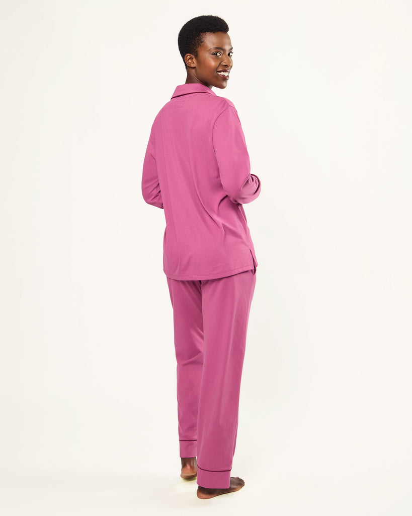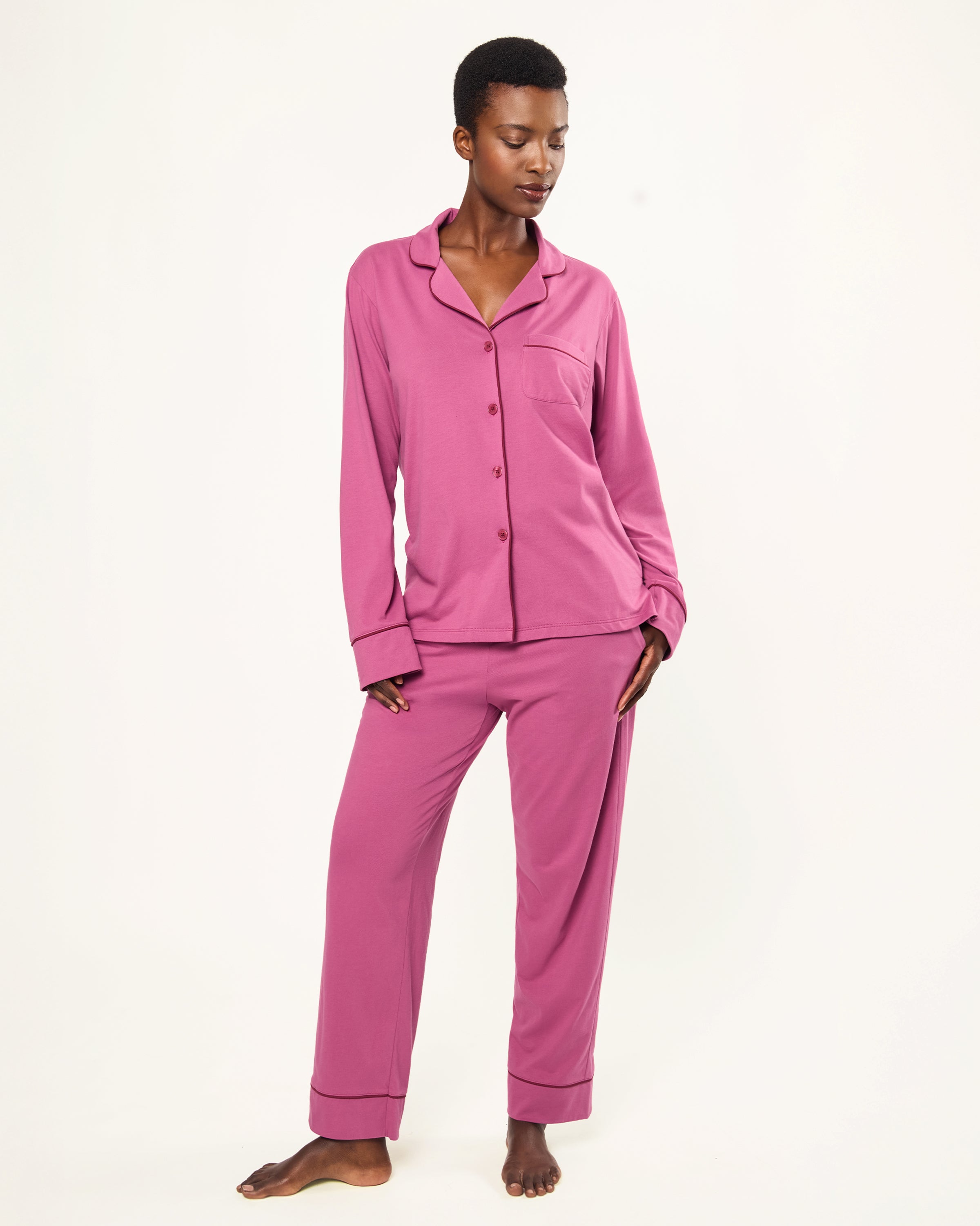 A rich, romantic new shade of buttery soft Pima pajamas. This elegant rosewood design will be an instant sleepwear staple.