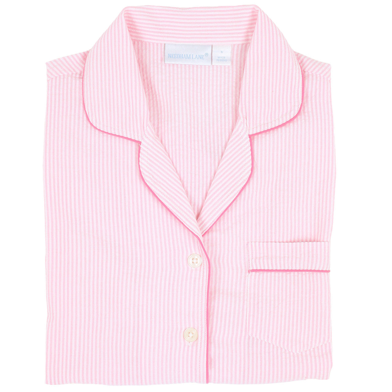 Women's short sleeve capri pajama set. Very soft cotton seersucker. The most comfortable seersucker that you'll find. Our pink & white striped seersucker is made into your favorite pjs and finished with dark pink piping. Light, cool and comfortable women's summer pajamas. Seersucker cotton is woven so that some threads will bunch together. This bunching of threads causes the fabric to be slightly puckered and thus held away from the body. Keeping the fabric away from your skin helps air flow and to keep you cool. A classic fabric for year round wear. If you experience hot flashes at night, seersucker can help deliver you cool nights. No need to look further for wonderful seersucker sleepwear, you've found it here at Needham Lane.