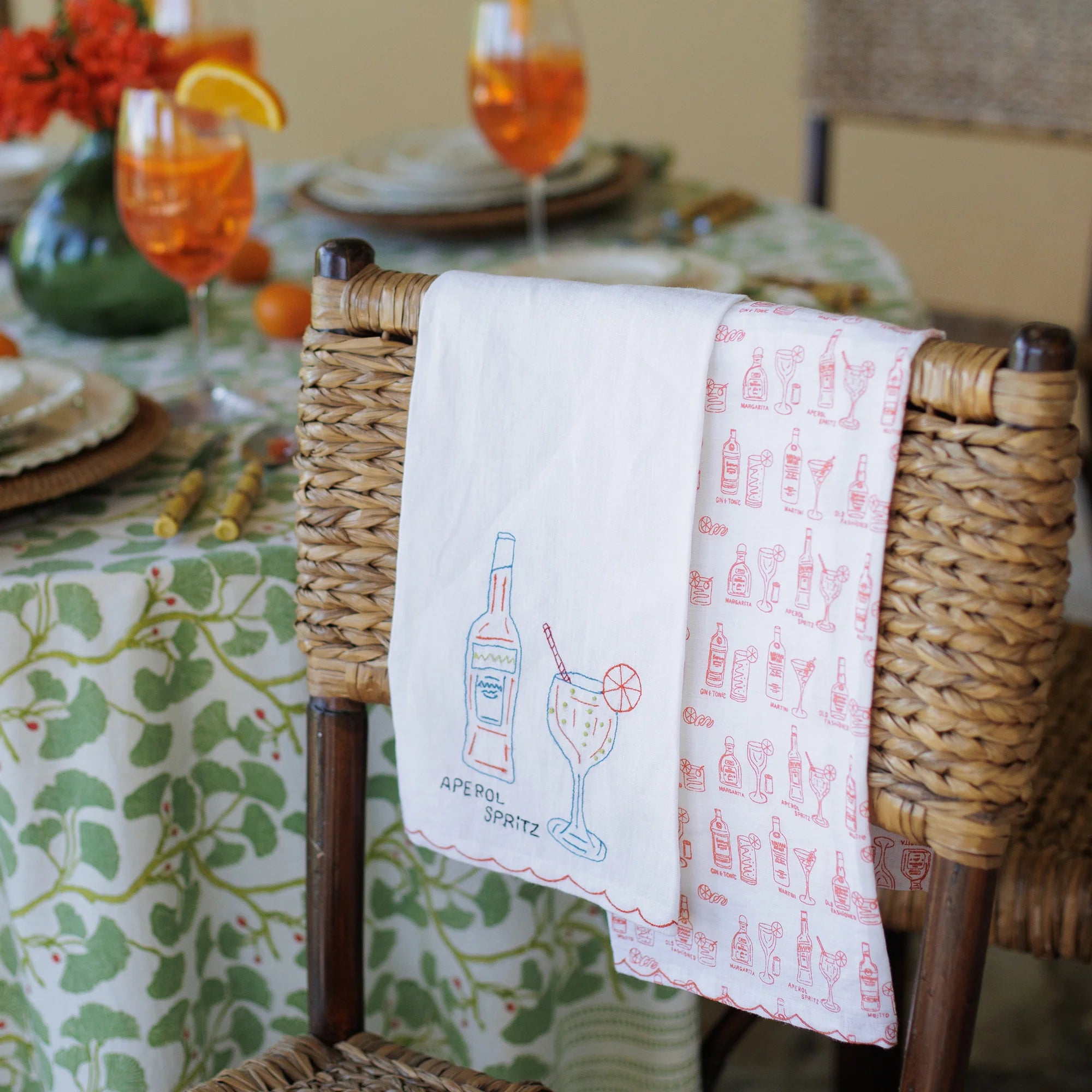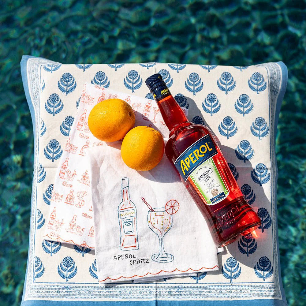 Brighten up your kitchen with this delightful set of Aperol Spritz Tea Towels. Each set includes two unique designs—one embroidered and one printed. The embroidered towel features a charming Aperol bottle and glass, intricately stitched in vibrant orange and blue hues, while the second towel showcases a playful all-over print of classic cocktail motifs, including spritzes, margaritas, and more.