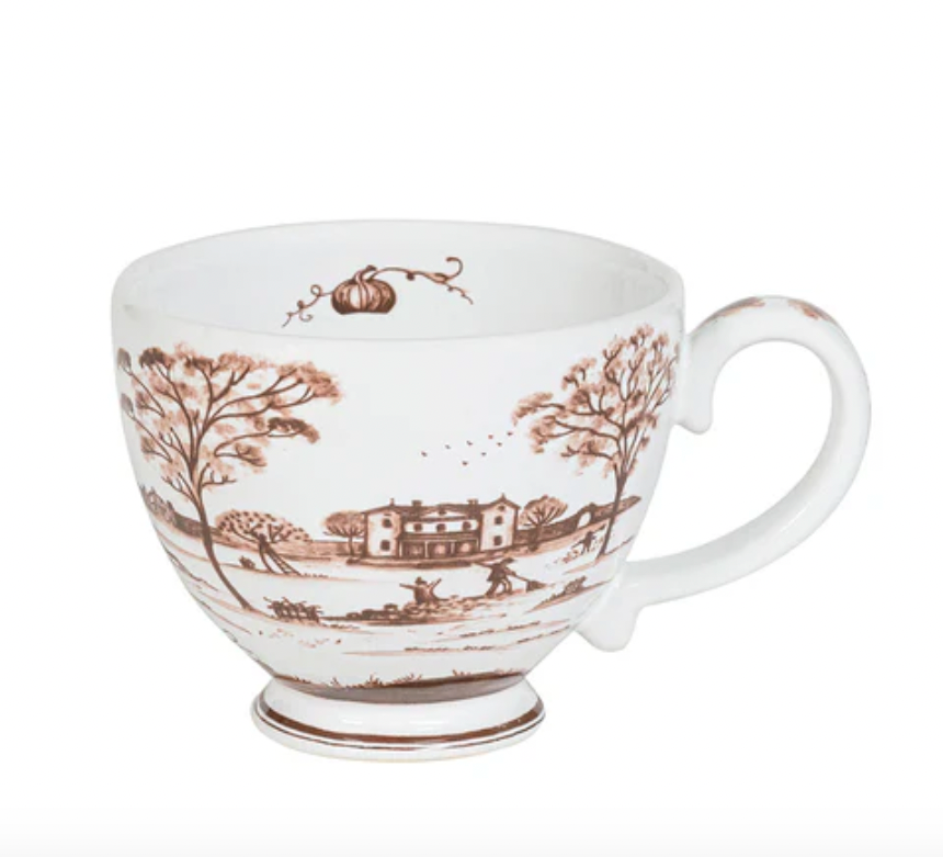There’s a sense of romance in the elegant shape, sepia hue, and idyllic pastoral scene on this painterly breakfast cup that pairs perfectly with coffee on crisp fall mornings, afternoon apple ciders, and evening tea by the hearth.