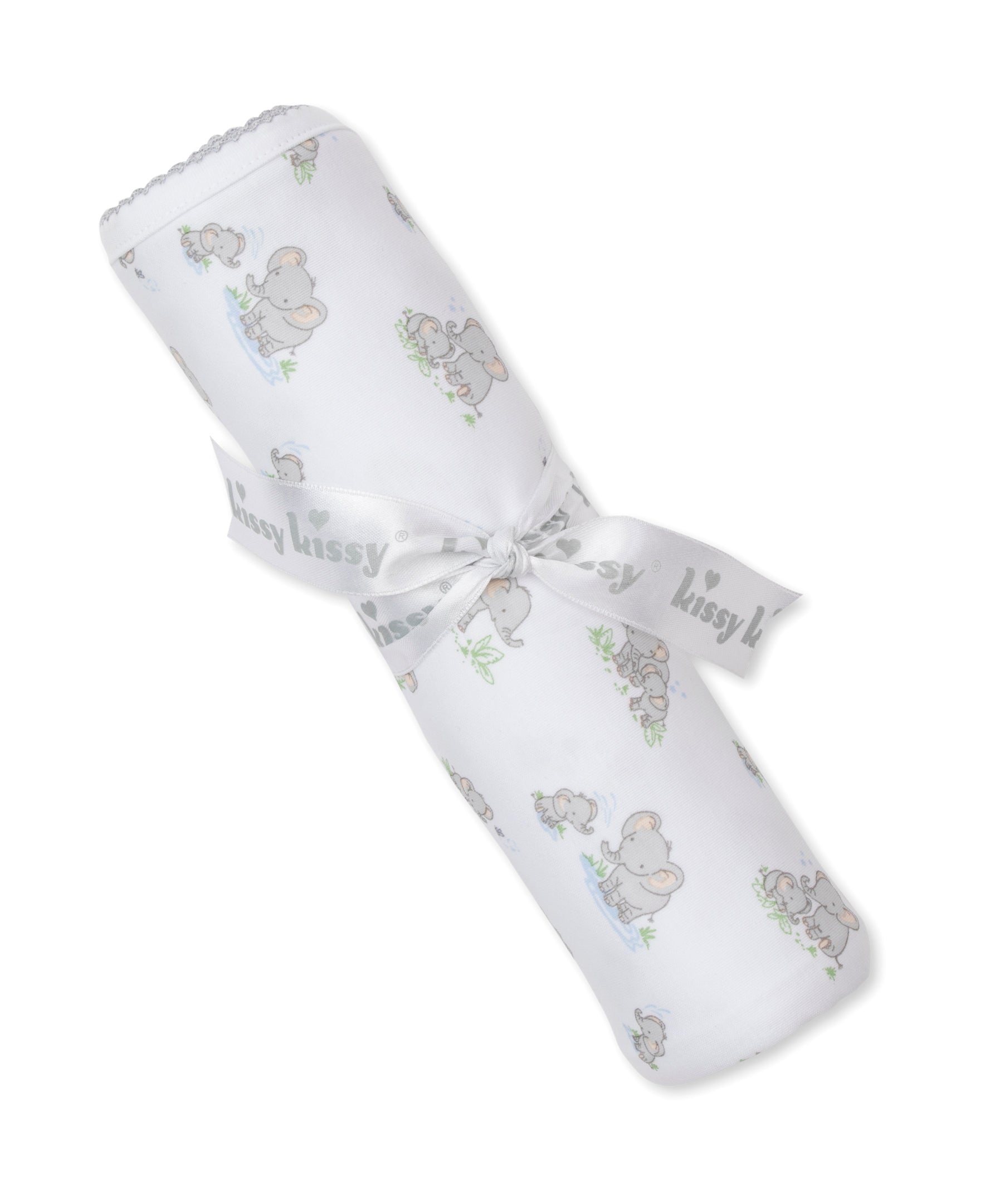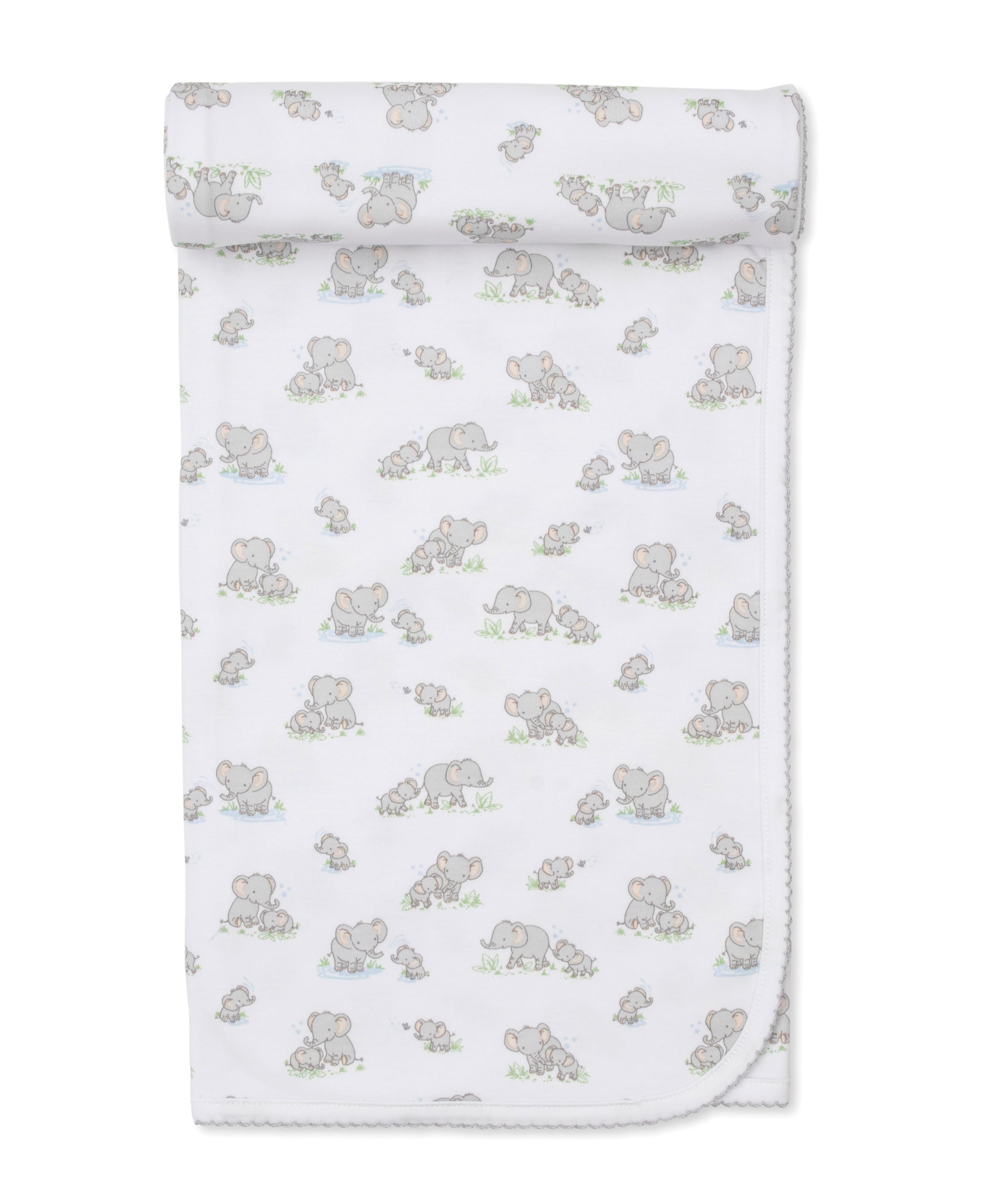Wrap baby up in ultimate softness with this cozy white Pima cotton blanket featuring hand embroidered elephants.