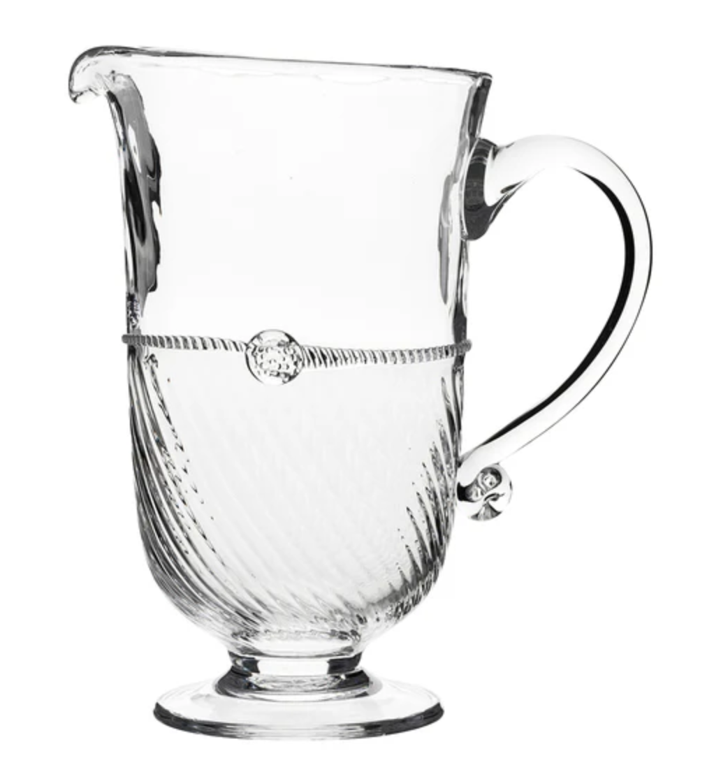 From our Graham Collection- Crowned with a simple thread and single berry, dressed in optic glass from the waist down and belted with a charming sash this large pitcher is a supreme vessel for iced tea, sparkling water or pink lemonade.