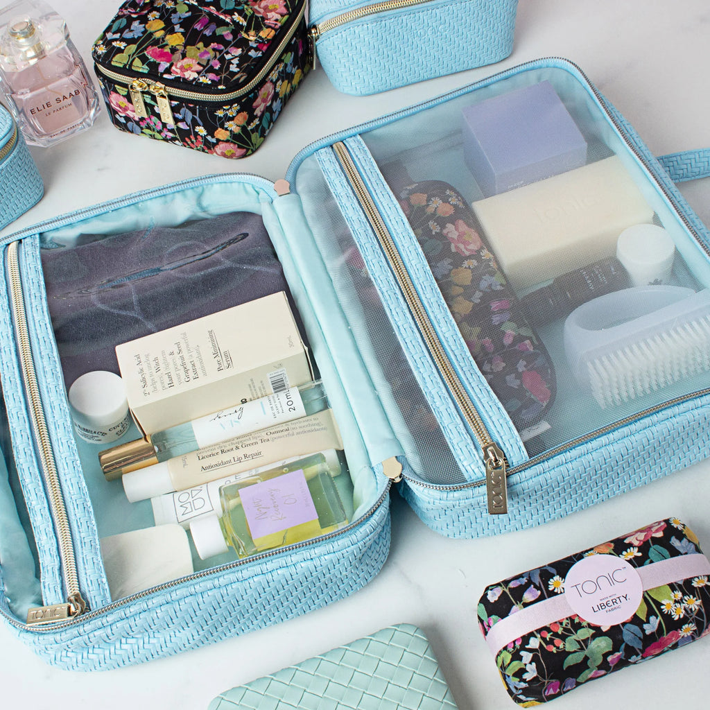 Brighten your beauty routine at home or away with the Herringbone Hanging Bag in Bluebell. Featuring elegant gold double zips that open to reveal 2 large compartments sized perfectly to fit your toiletries and a convenient hanging hook. The additional zipped compartments inside and out are ideal for keeping smaller items organised while the double handles make it easy to keep it close to hand while on the move. Featuring the unique texture of Herringbone and an easy clean nylon lining, the Hanging Cosmetic Bag is the perfect addition to your travel wardrobe.