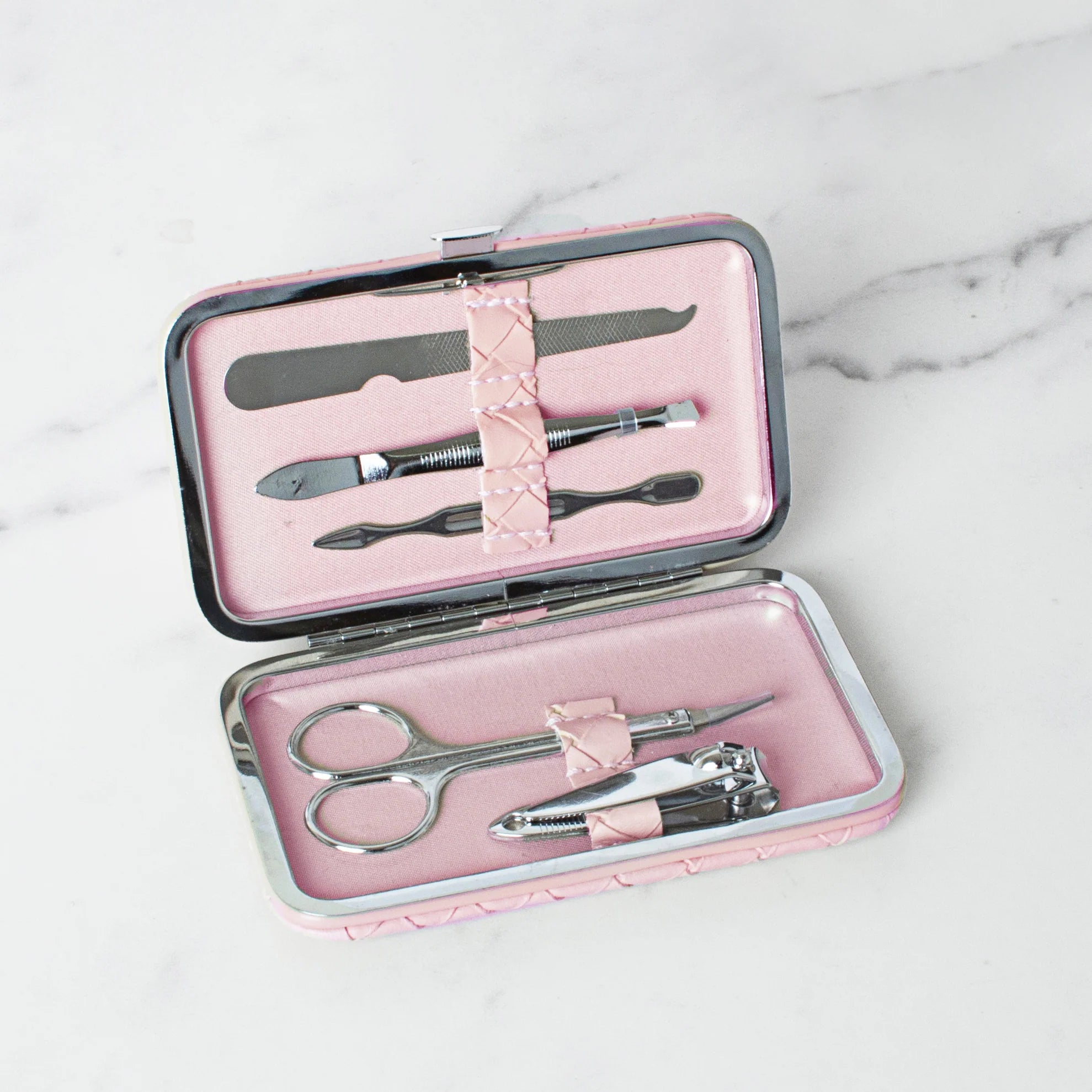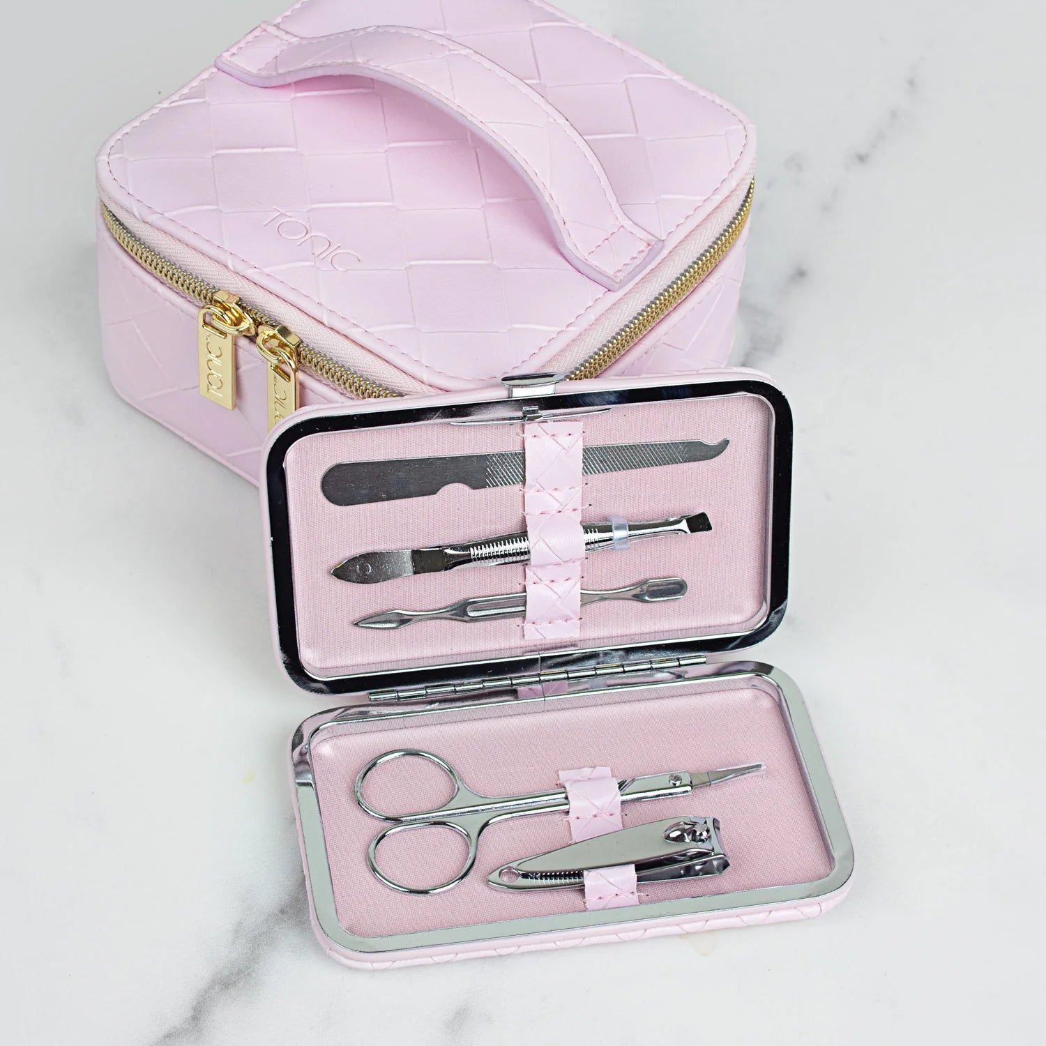 Practical and compact, our Woven Manicure Set in peony pink is perfect for keeping your nails tidy whether at home or while travelling. Featuring a sturdy clasp that opens to 5 nail care tools made from high quality steel and secured with elastic loops, this set is a beauty essential that can easily fit in your handbag, luggage or makeup drawer at home.