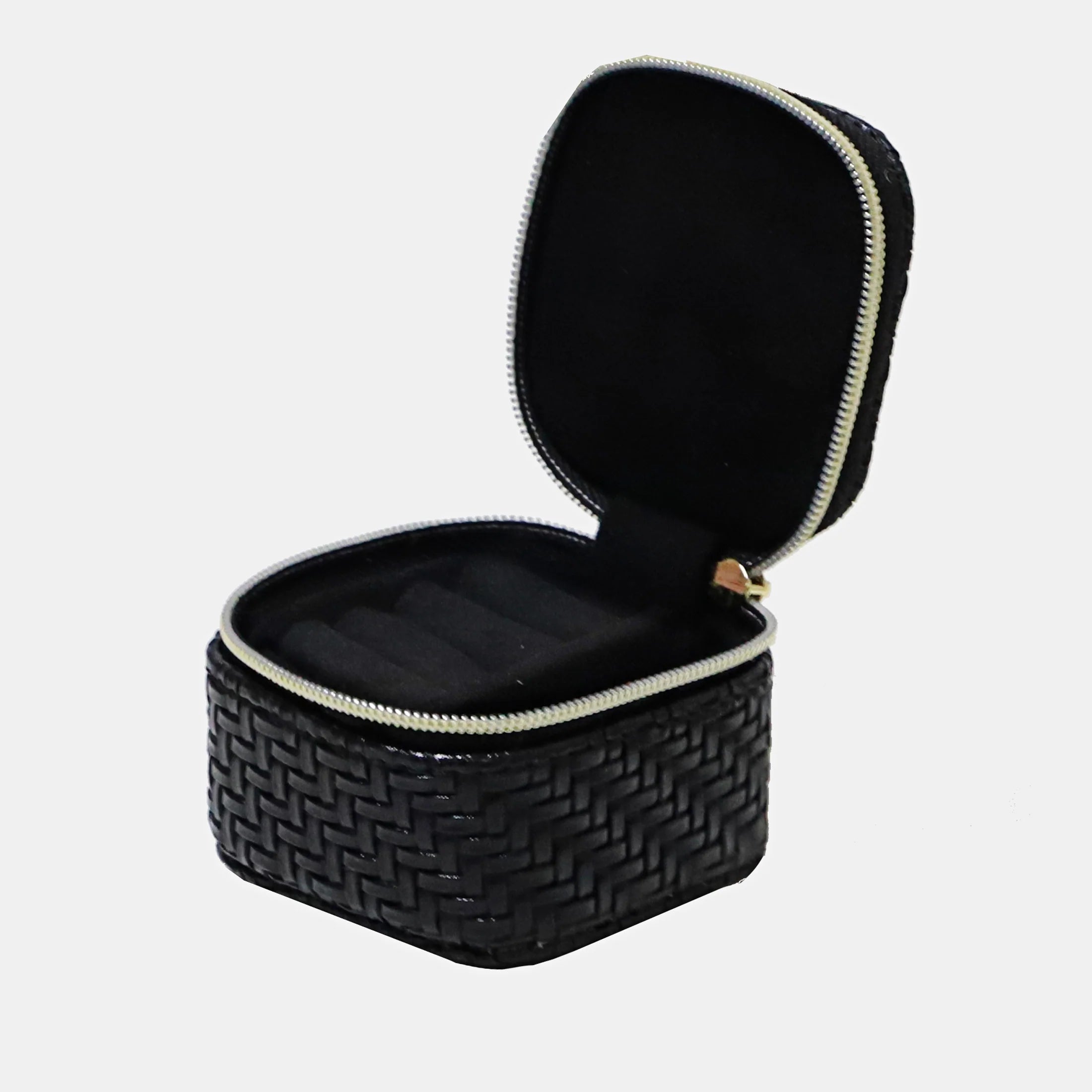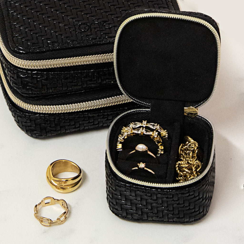 Crafted from elegant herringbone textured vegan leather, this handbag sized version of the Tonic Jewellery Cube is perfect for keeping your most precious pieces secure. The Mini Cube has space for four rings and a side compartment for a necklace or earrings making it ideal for storing items you may need to remove before sleeping or while exercising. Keep your favourite jewellery items safe and easy to find in your handbag, gym tote or just sitting pretty at your bedside with the new mini cube.