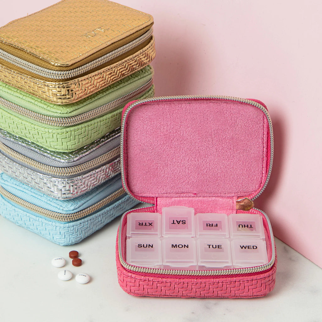 Elevate your daily vitamin and medication regimen with the Herringbone Pill Box. Featuring a herringbone textured outer in bright Raspberry, you'll never lose your essentials again! A beautiful way to keep your wellness routine organised. This pill holder is perfect for travelling or keeping close at hand everyday.