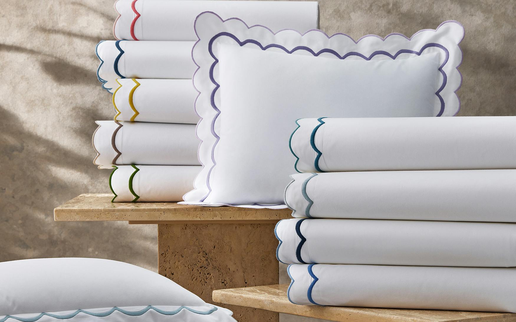 India owes its playful sophistication to an original take on embroidery. Along its narrow, scalloped flange are two carefully stitched lines in distinct tones. Our 520 thread count Ceylon percale is the base fabric for this sweet, elegant collection.