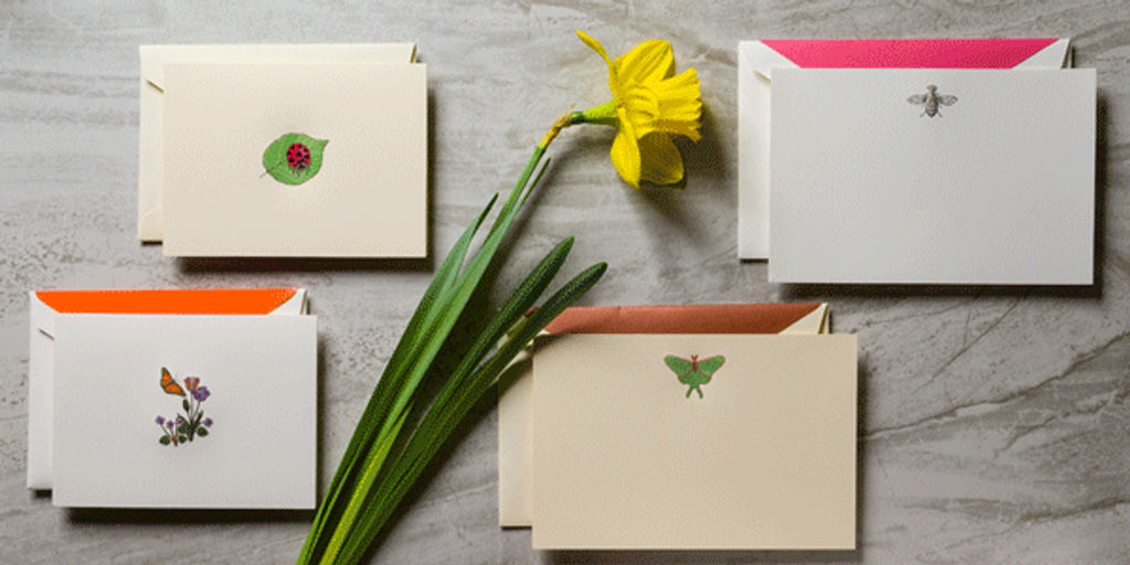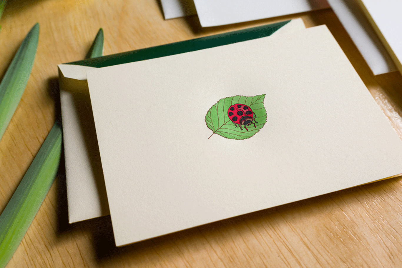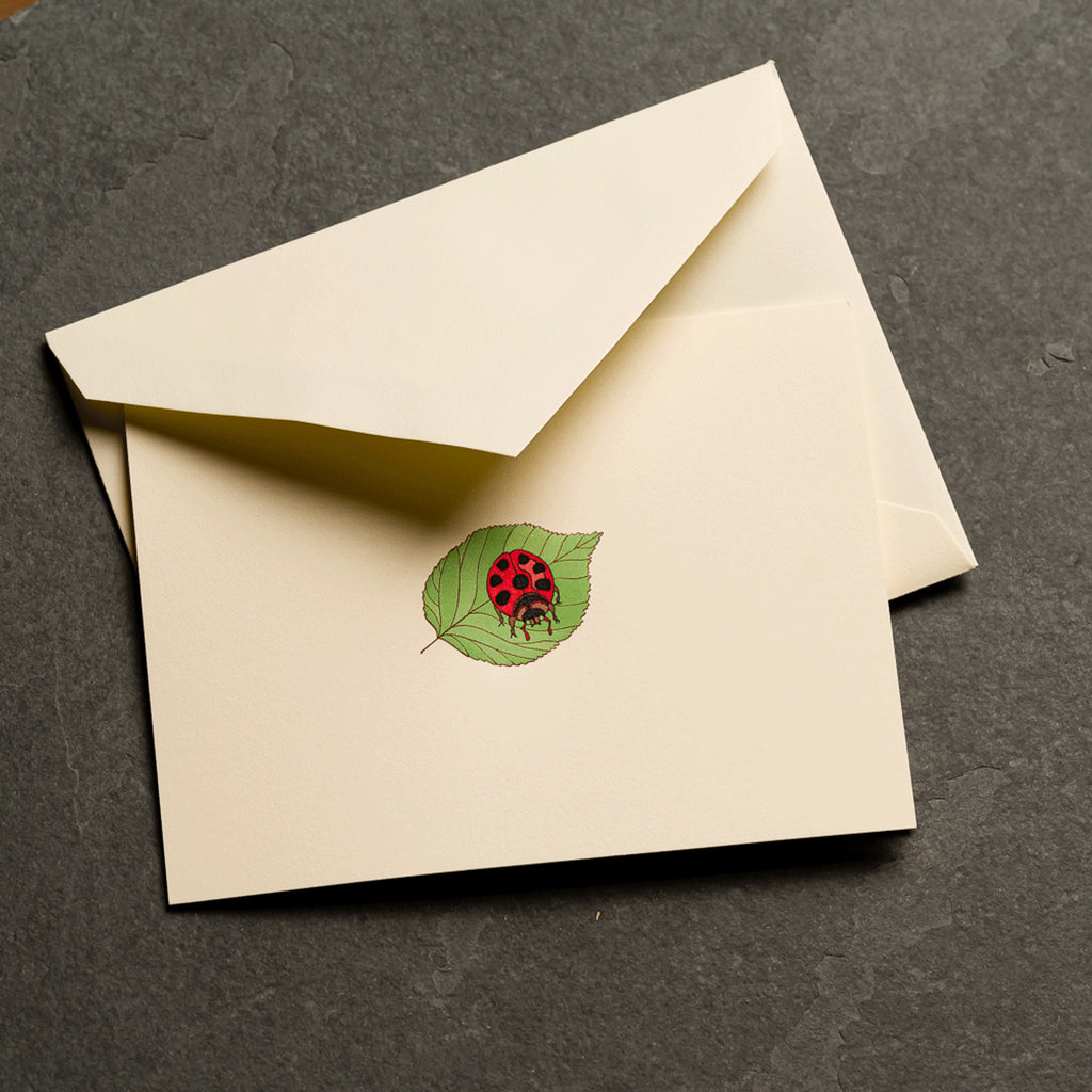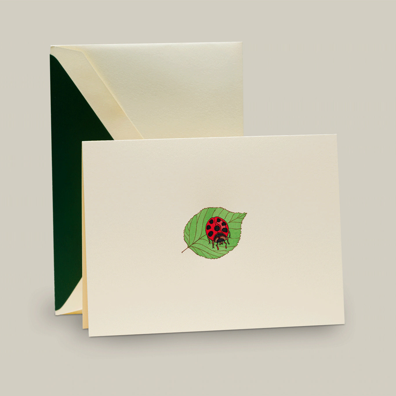 A charming ecru folded note featuring an exquisitely engraved ladybug perched on a delicate leaf. Paired with a coordinating hunter green-lined envelope for a touch of natural elegance. Perfect for heartfelt notes, thank-yous, and everyday correspondence.
