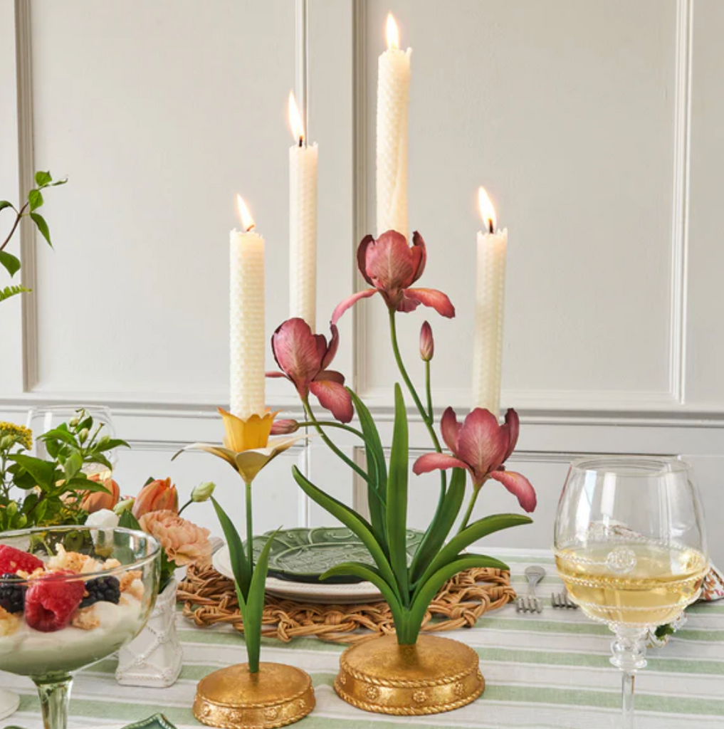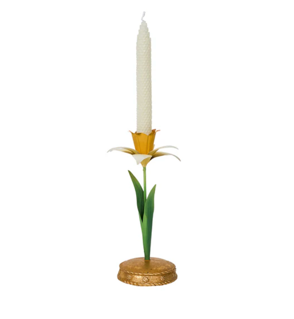 Spring is permanently sprung with this delightful Daffodil Candlestick that brings sophistication and joy to any tablescape. Made of intricately hand-painted metal in sunshine yellows, fresh greens and whites, upon a bright gold base that’s trimmed with our iconic Berry & Thread motif. The petals and leaves can be gently adjusted into any postures you like best.