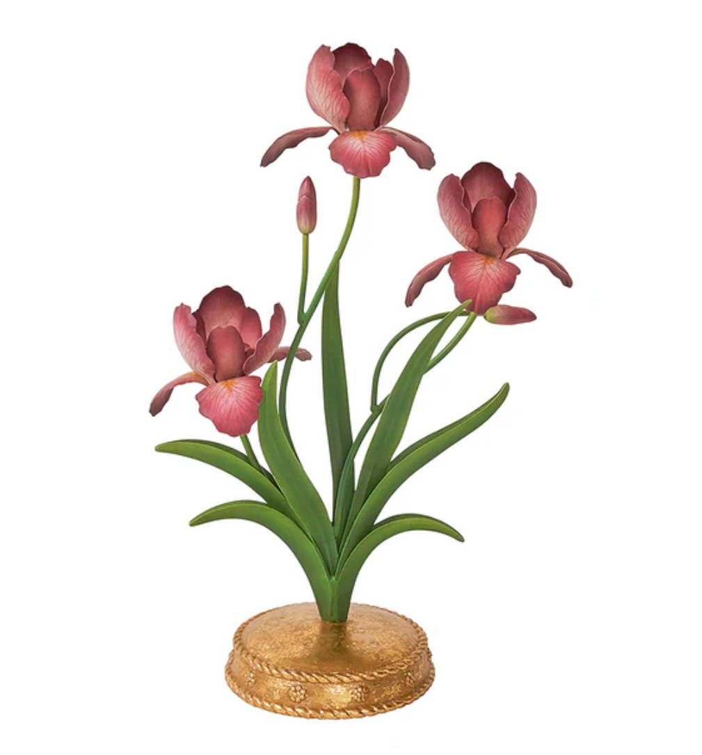 Spring is permanently sprung with this enchanting Iris Centerpiece Candelabra that brings elegance, joy, and a touch of whimsy to any tablescape. Made of intricately hand-painted metal in rosy pink hues upon a bright gold base that’s trimmed with our iconic Berry & Thread motif. The petals and leaves can be gently adjusted into any postures you like best.