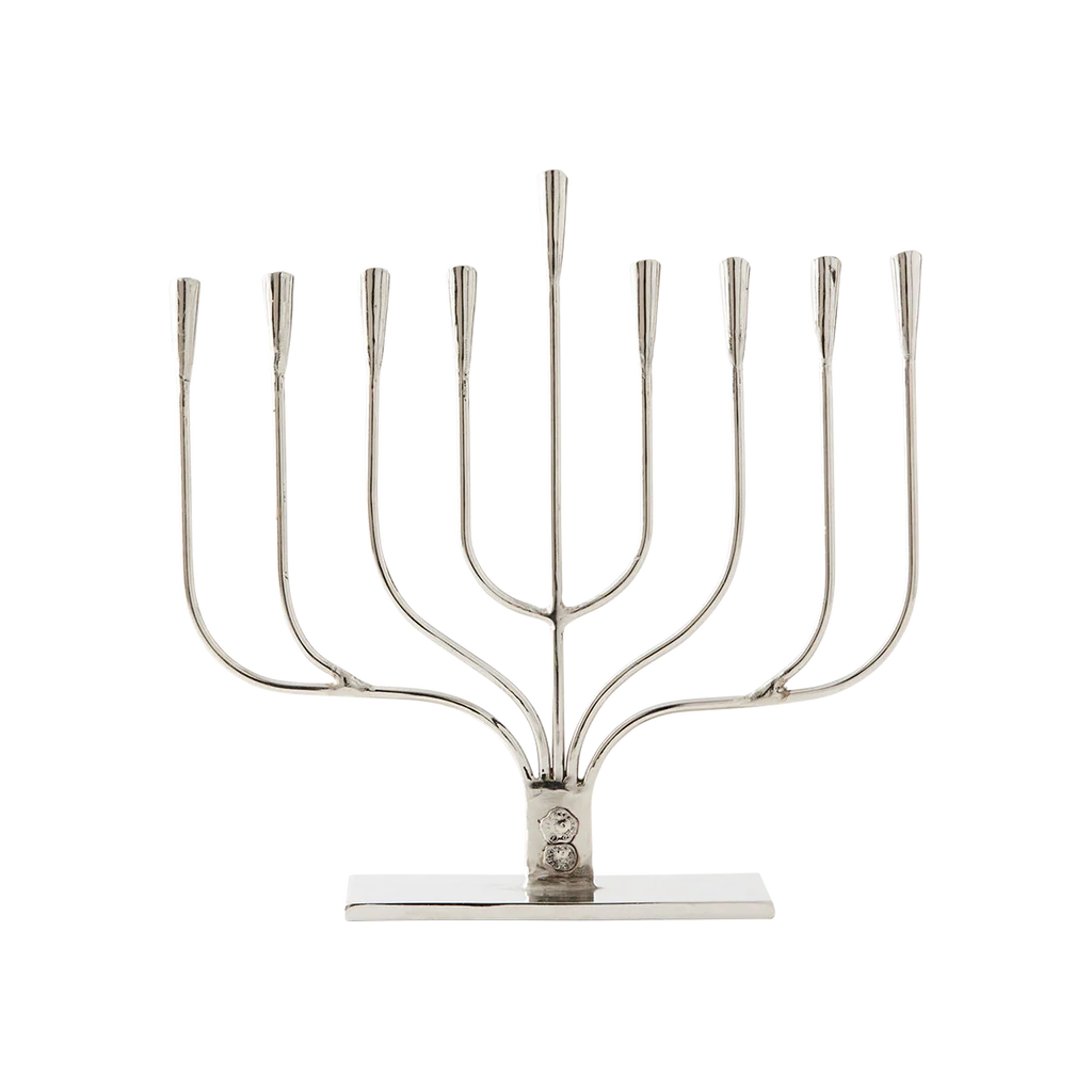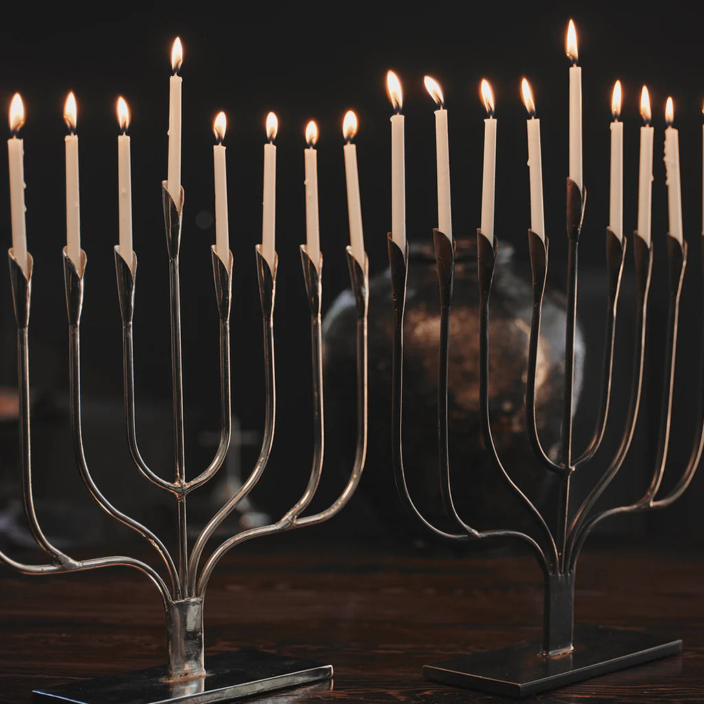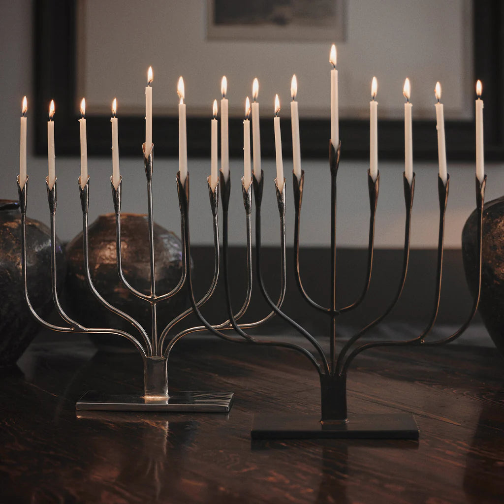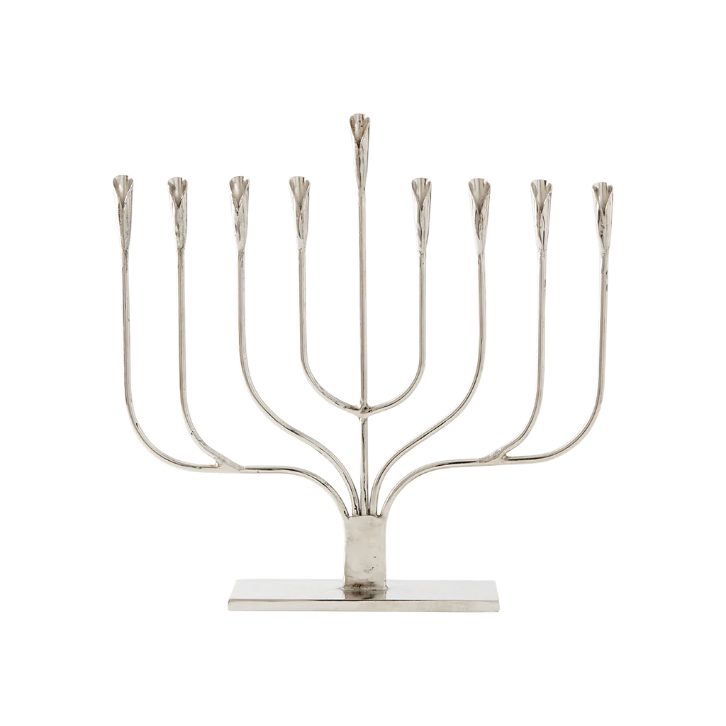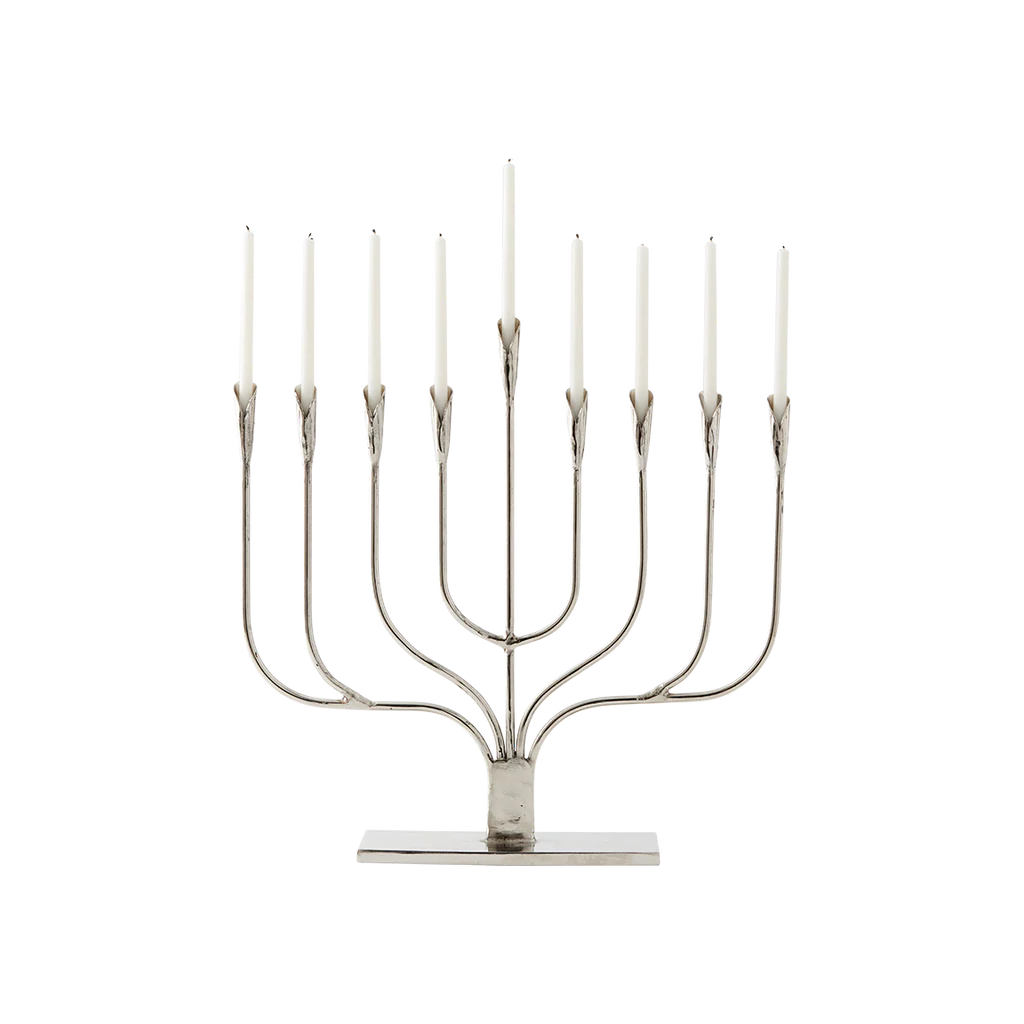 Timeless forged iron menorah in nickel plate with petal candle holders on a rectangular base.