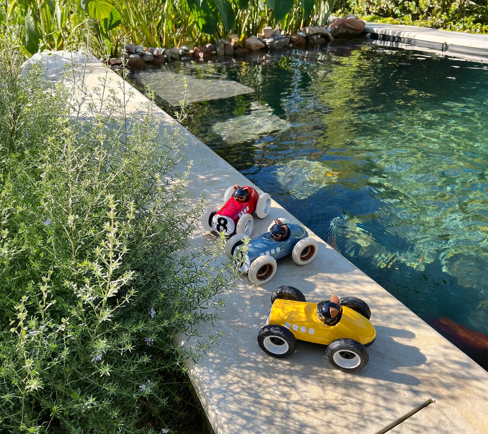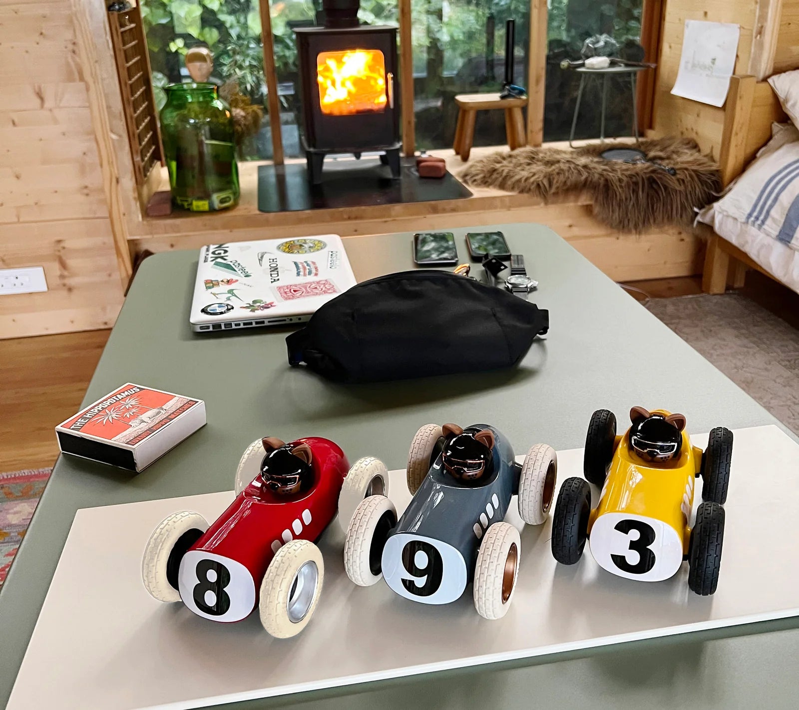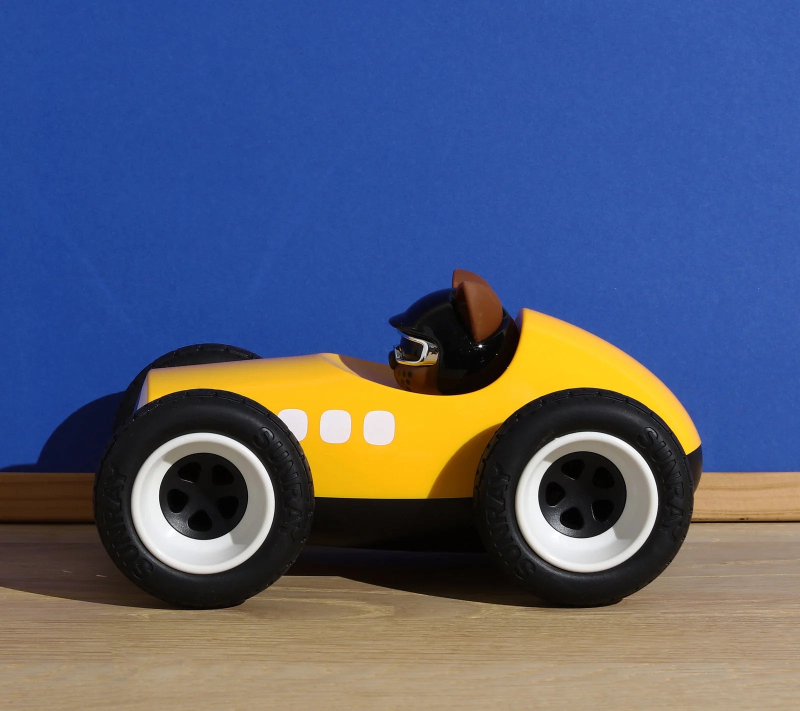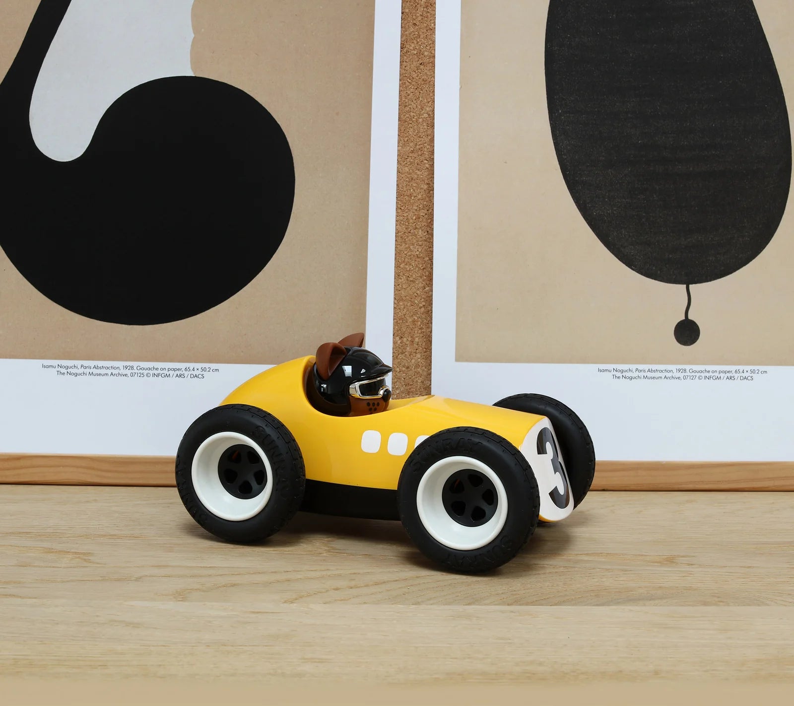 Now, Rufus (Dog Car) has a fierce competitor and he will need to wear his best game face. Let’s talk about those crazy wheels! The thinking behind the extravagant shape is an amalgamation of the beefy 80’s yo-yo and rally car wheels of the same era and yes, they are as impossibly deep as we could make them and to give them an even wider stance we’ve added that exaggerated lip. We call these wheels the 5 spoke wacky classics wrapped in Sunray rubber. Anyway, let’s not waffle. Line up Rufus and Karlos on the grid and let’s get racing.