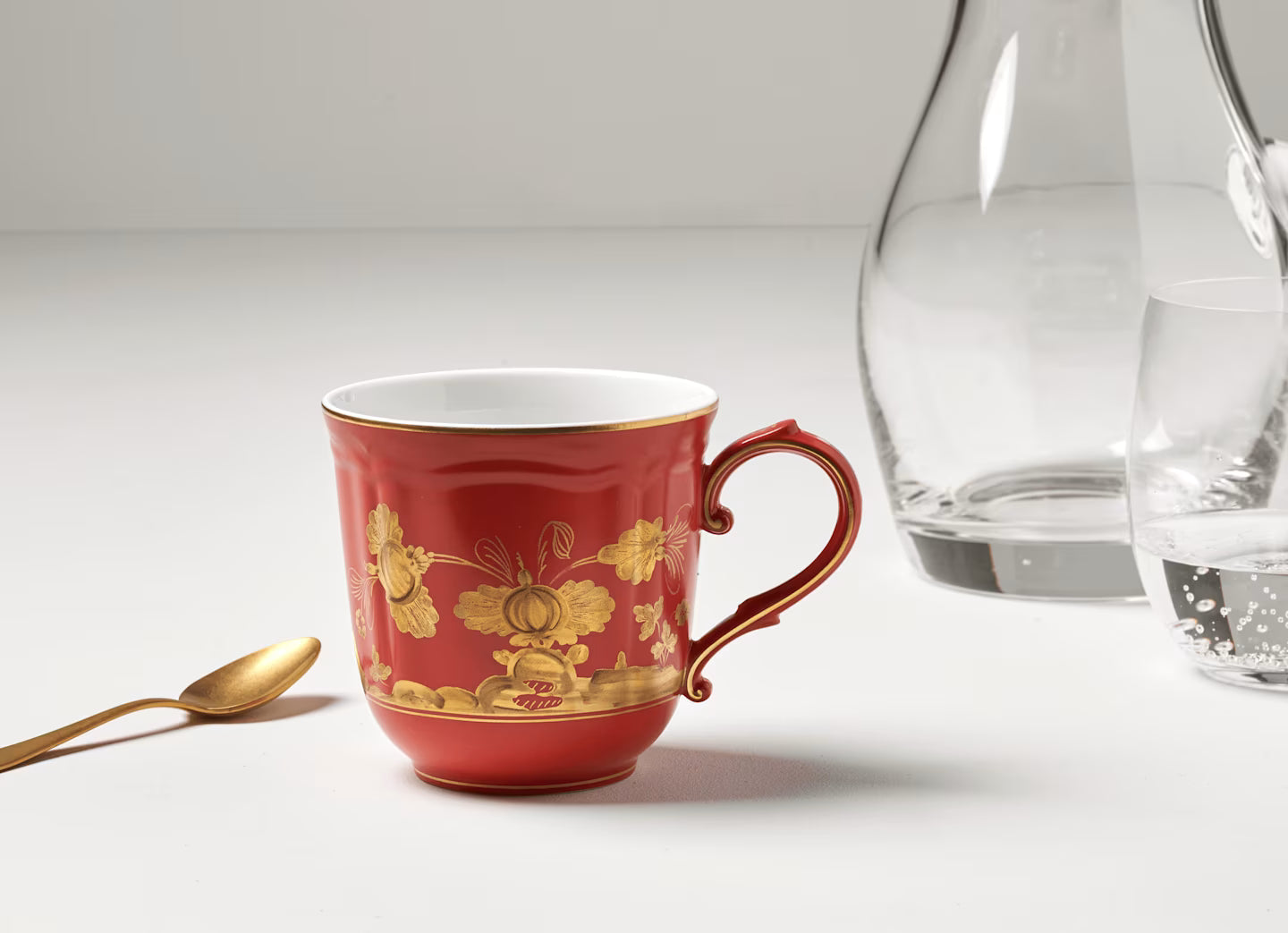 The mug is characterized by a floral decoration in pure gold that stands out in contrast with the red of the porcelain as a tribute to Italian savoir-faire. It evokes the delicate flower of the Garofano (Carnation) and magical atmospheres that come alive through the classic design of the iconic shape Antico Doccia. For a warm tea or a refreshing herbal tea, the cup in the Rubrum color accompanies every moment of relaxation with a sophisticated and welcoming atmosphere. Also suitable for a gift in the unmistakable style of Ginori 1735, it completes the entire tableware, tea and coffee, home décor and fragrance diffusers of the Oriente Italiano Gold Collection also in the refined Aurum variant. For a unique and daring complete service, it perfectly matches the articles of Oriente Italiano, through color combinations that express personality and amaze guests with always original combinations.