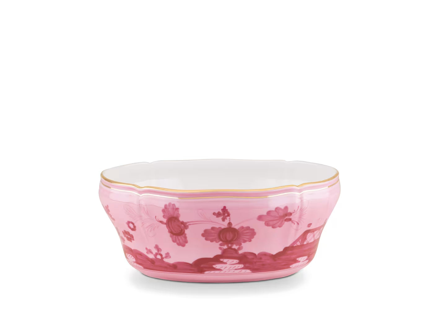 Porpora salad bowl in porcelain with gold threading. Oriente Italiano collection. It is distinguished by the famous "carnation" motif that stands out in contrast against the fine porcelain painted a deep purple-pink. Precious gold threading, distinctive to Ginori 1735, illuminates and embellishes the design. Oriente Italiano is a colorful collection of tableware, tea and coffee sets that tells of a passion for creativity and the search for sophisticated combinations for mise en place, always unique and original.