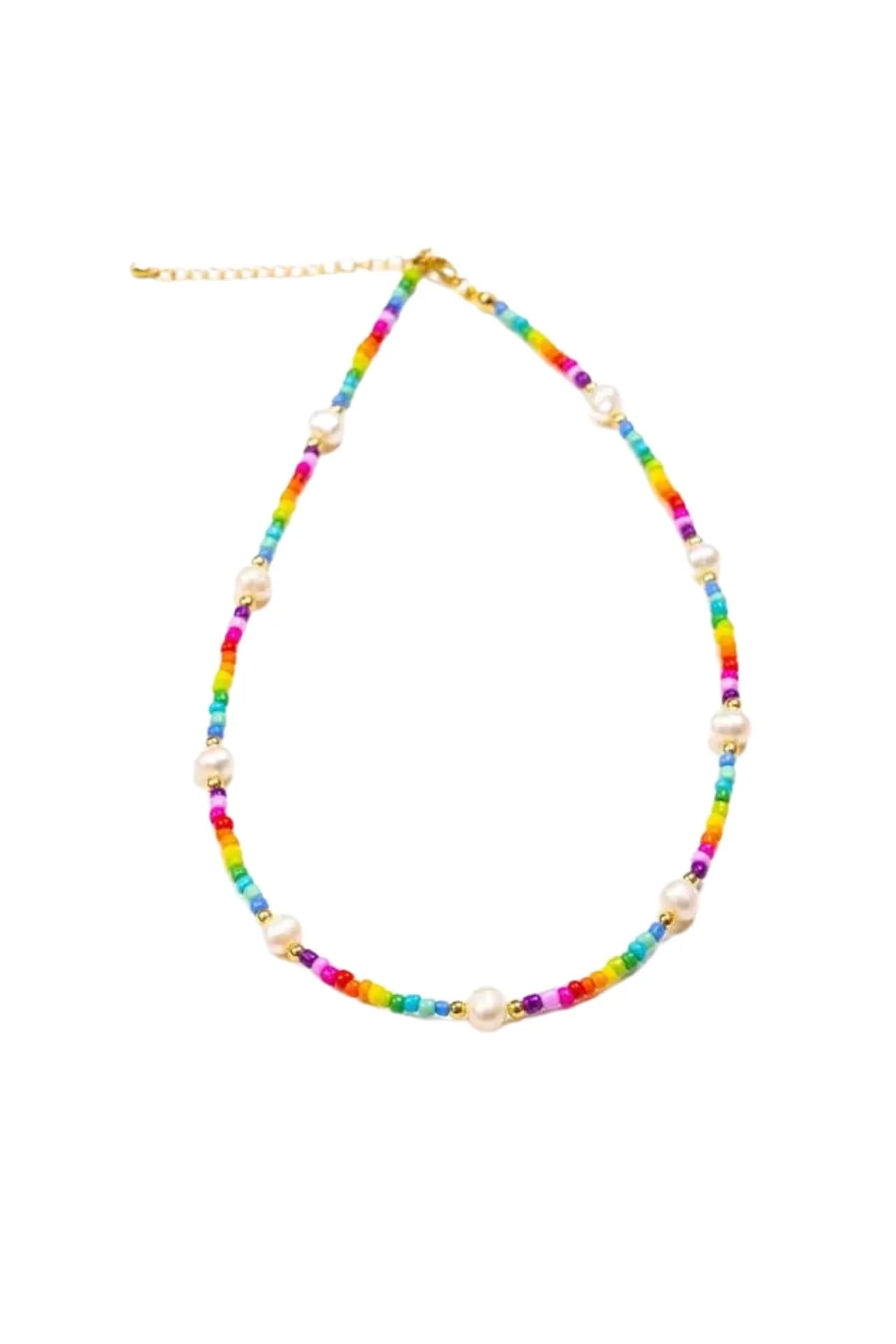 White Beaded Necklace with Rainbow & Smiley Face Beads.