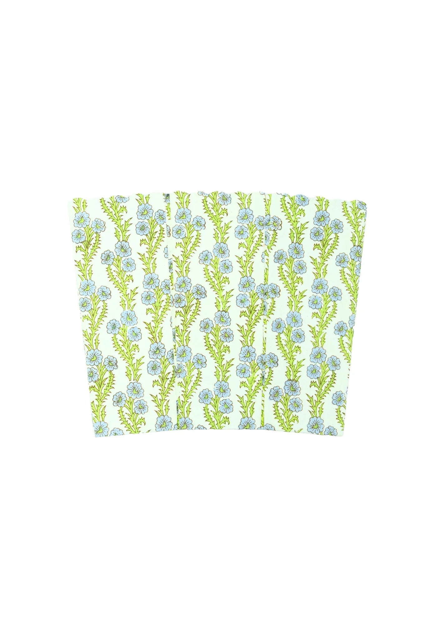 Add a splash of artistry to your home with this stunning block-print scallop bin. Crafted by skilled artisans, each piece is a one-of-a-kind masterpiece, featuring our bestselling Araminta pattern. Perfectly versatile, this bin is as functional as it is beautiful—ideal for tidying up a room as a waste bin or repurposing as stylish storage for magazines, toys, or craft supplies. The scalloped edges lend a playful touch, while our block-print pattern adds an elegant touch of color to any room. This bin is collapsible so it is easy to store and put away for space efficiency. A unique statement piece for those who appreciate form meeting function.