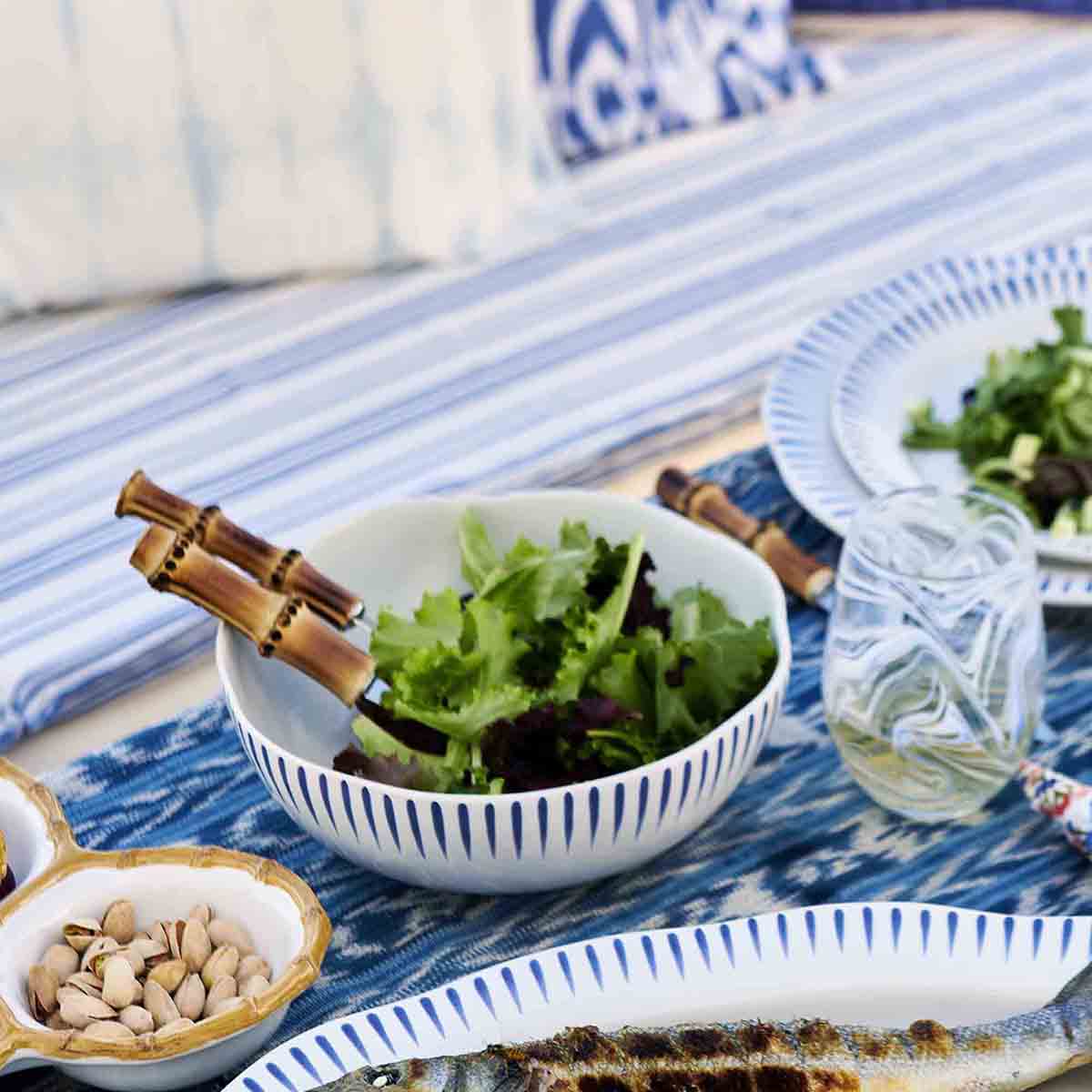 Accented by our artistic rim of radiant Delft blue stripes that express a subtle ta-da! with every serving, the wide basin and shallow depth of this coupe bowl is ideal for grains, pastas, salads and sides.