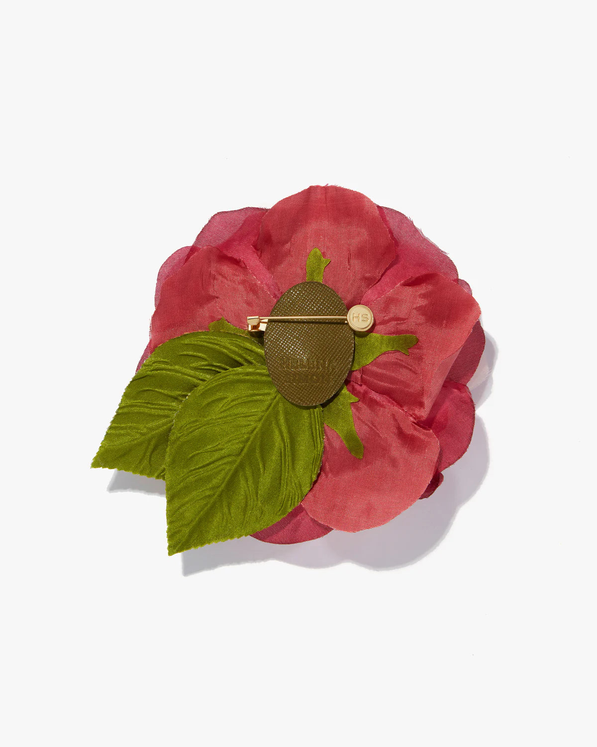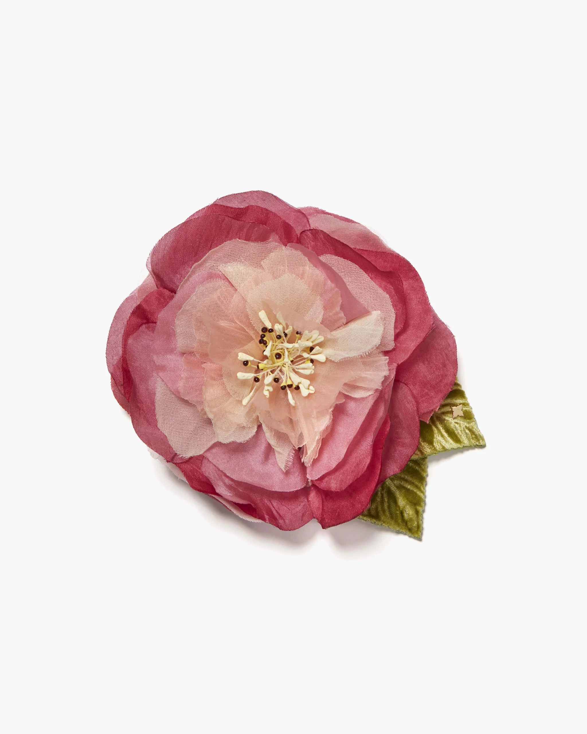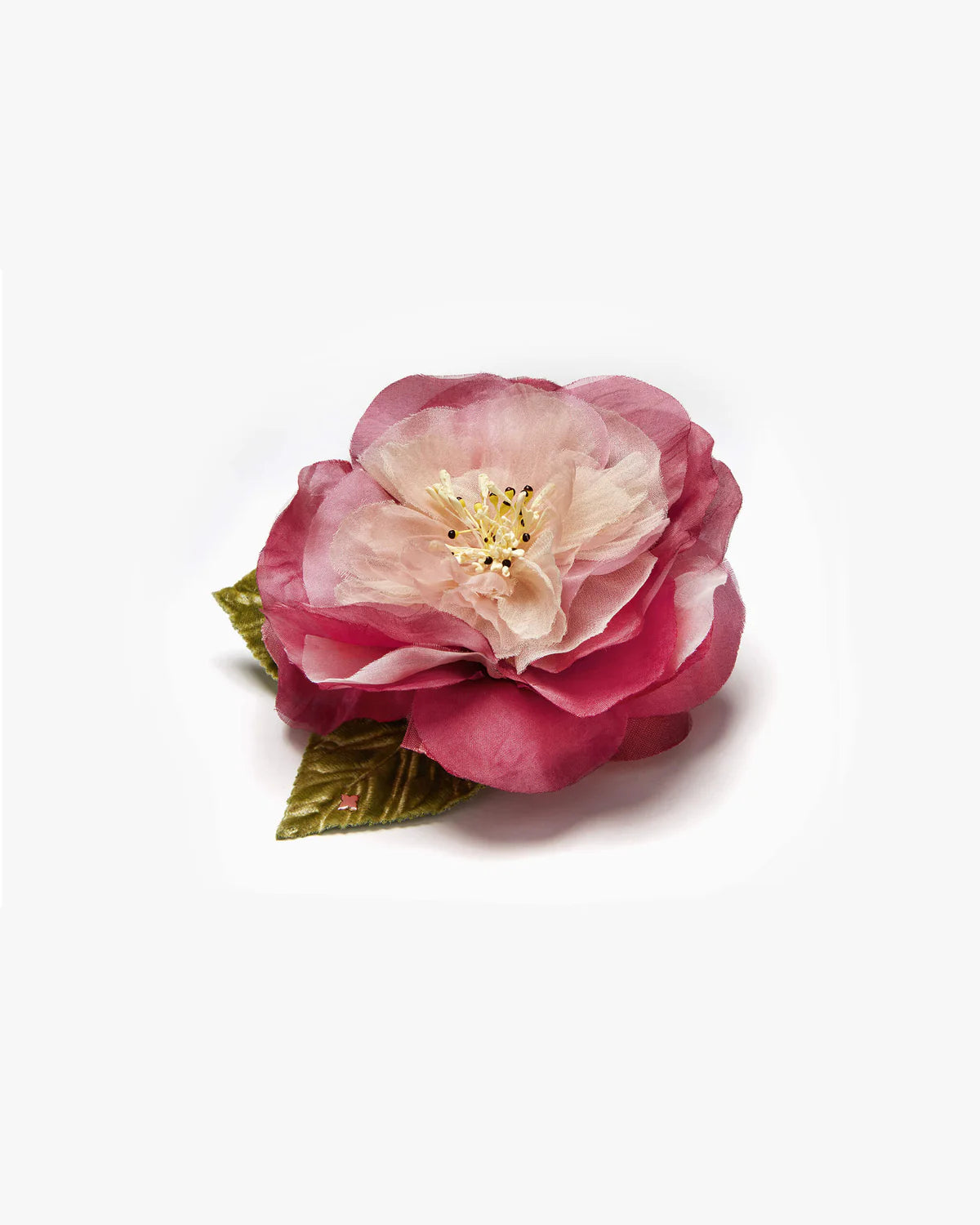 The queen of winter flowers, the camellia signifies devotion, passion and affection. A combination of delicately hand-painted pink and cream silk habotai, silk shantung and silk chiffon petals are paired with hand-dyed yellow and ecru stamens and chartreuse silk velvet leaves. The camellia is the birth flower of the month of November and the state flower of Alabama.