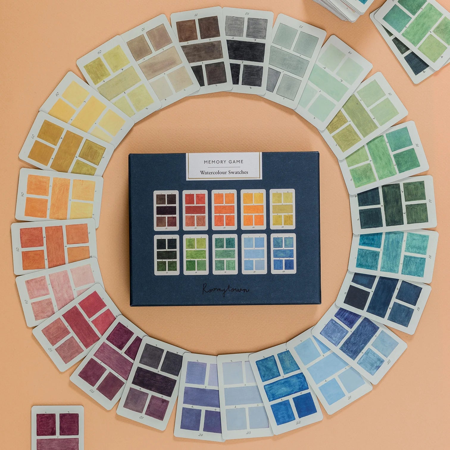 This Watercolour Swatches Matching Game includes 24 pairs of cards featuring artwork inspired by a vintage book written and illustrated in 1692 about mixing watercolours. Roomytown's design team in Bath, UK, have carefully adapted and enhanced the original artwork and applied it to each of the cards to create this elegant matching game that tests your memory skills.